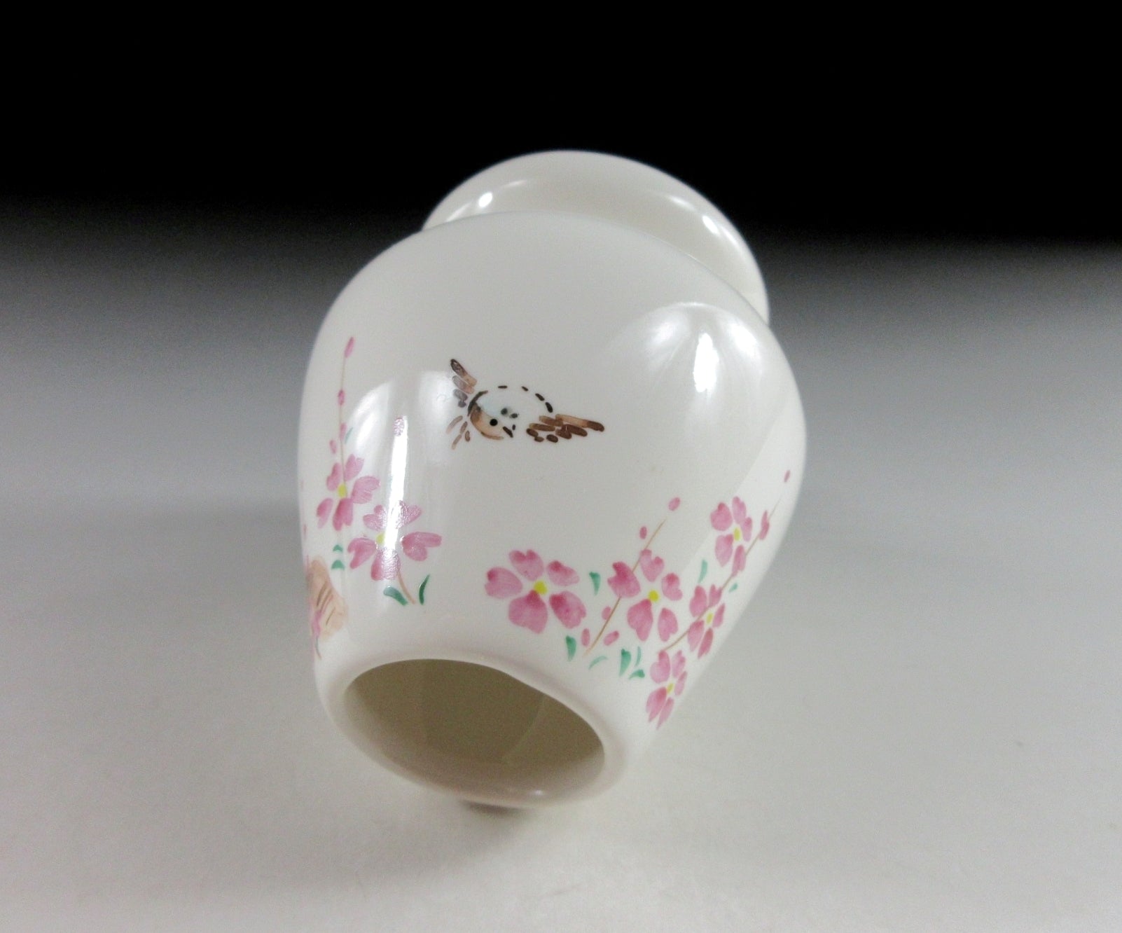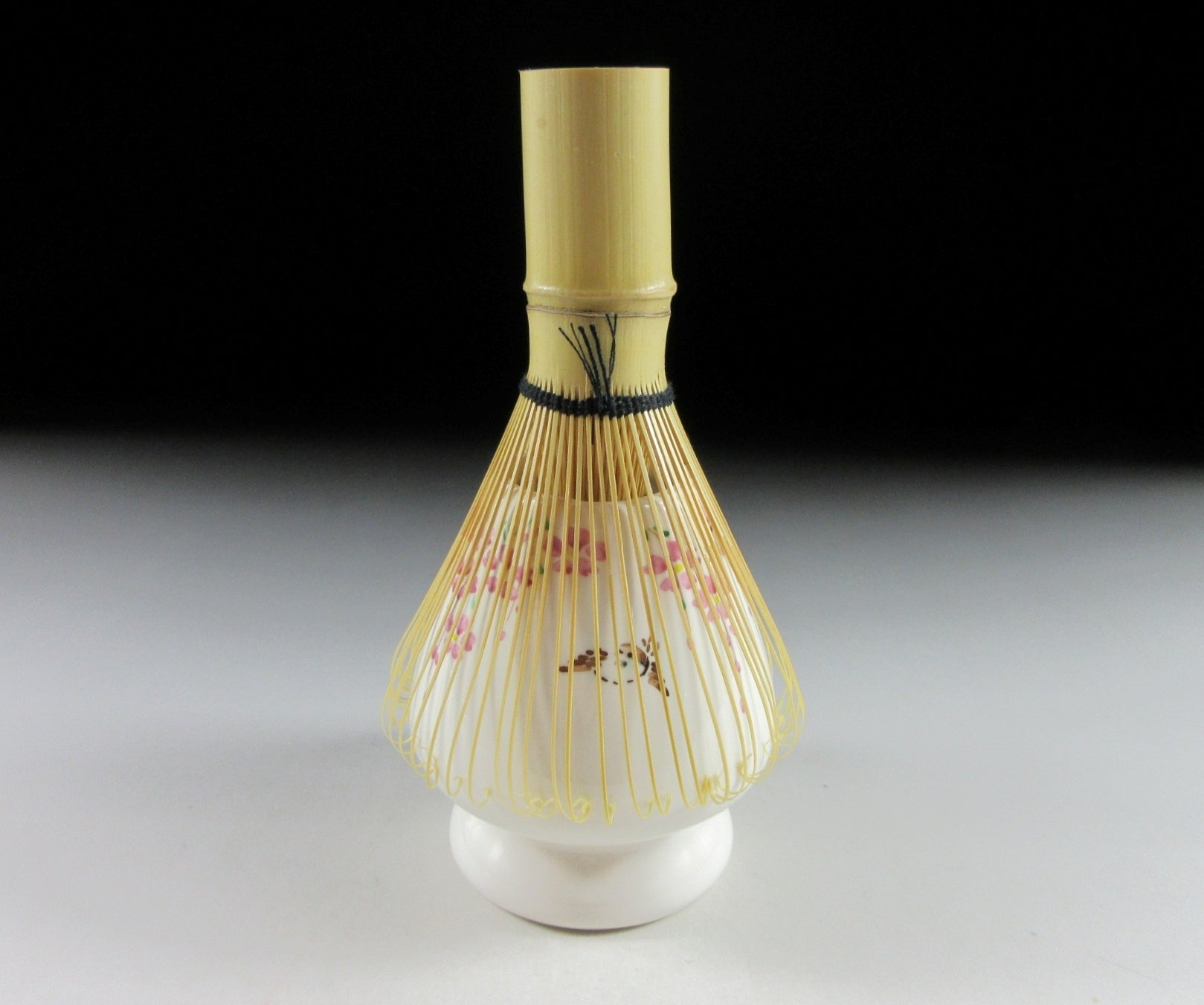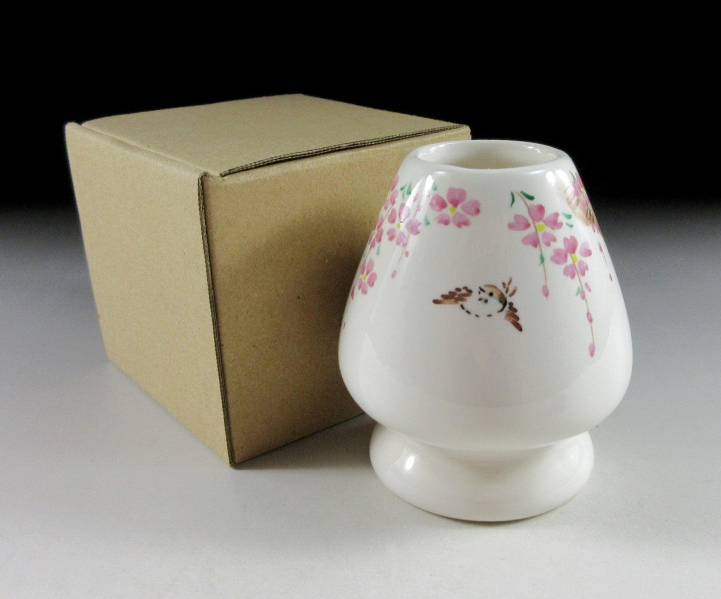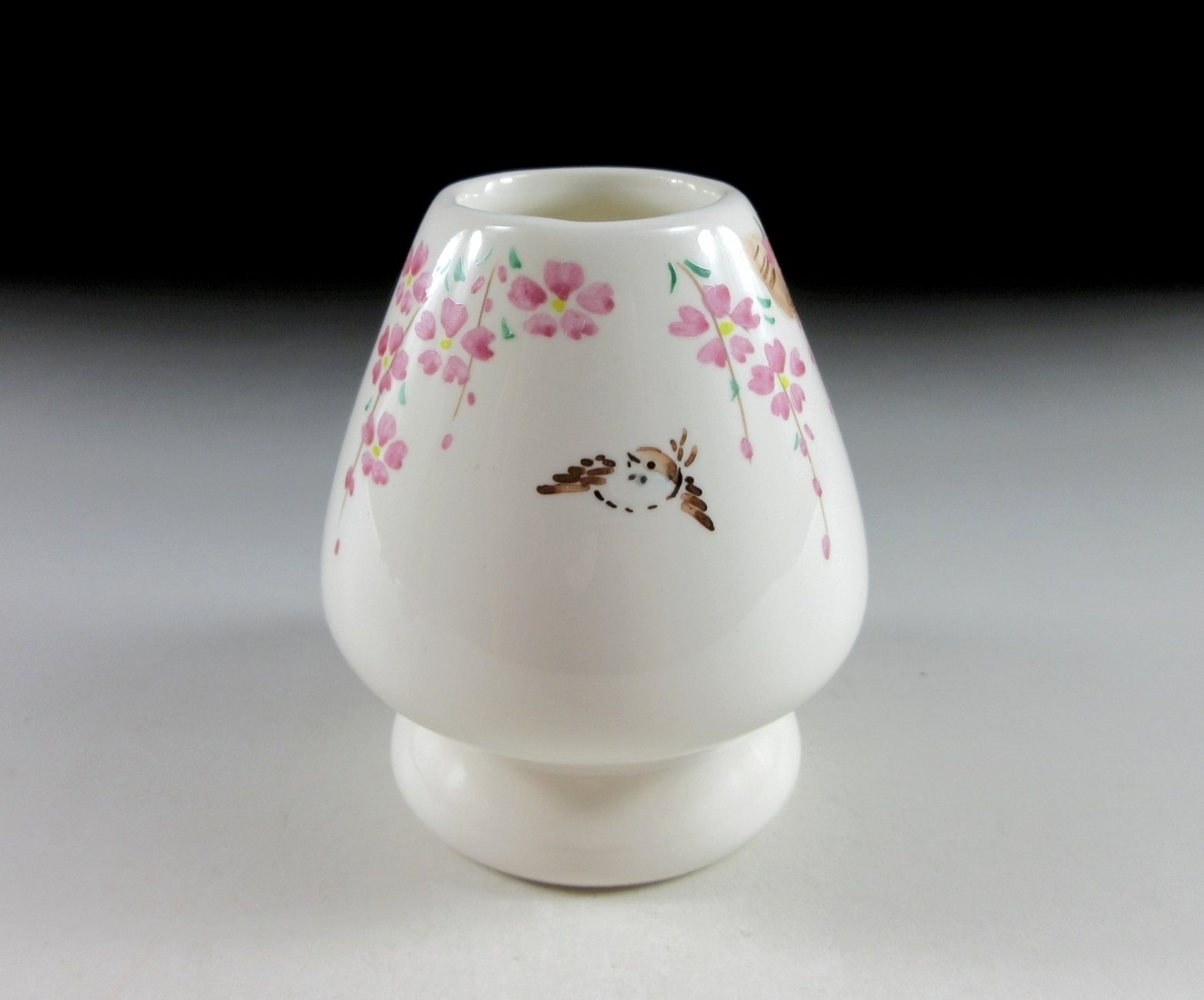 This listing is for a hand-painted chasen tea whisk shaper made by noted potter, Yagi Kaiho. The shaper’s job is to help your chasen maintain its shape whilst drying. After the tea whisk is dried it should be stored in a chasen zutsu. Care should be taken when placing your chasen on the shaper. Not placing the tines properly may result in broken ends. The shaper in this listing has a nice smooth surface which won’t snag the tines on your tea whisk, and it features hand-painted depictions of a sparrow with cherry blossoms. In Japan sparrows denote the gentle nature of an intellectual person, and sakura cherry blossoms are revered for their delicate beauty.