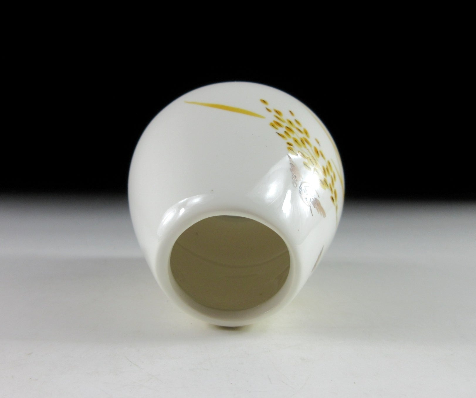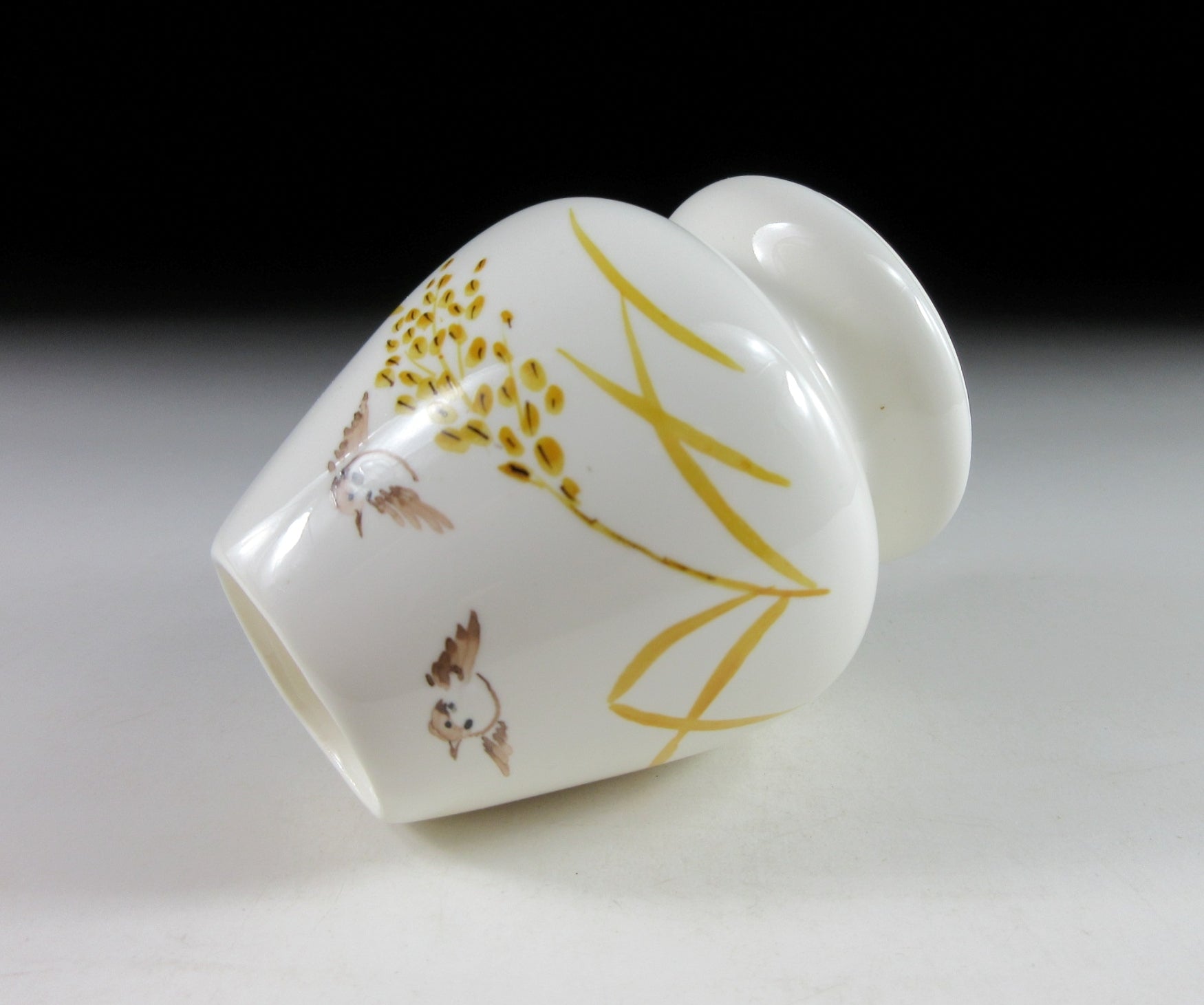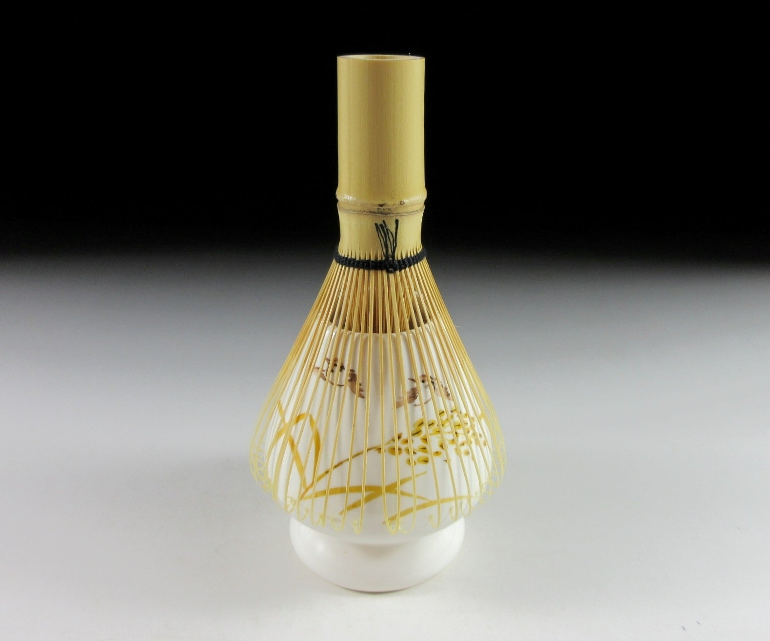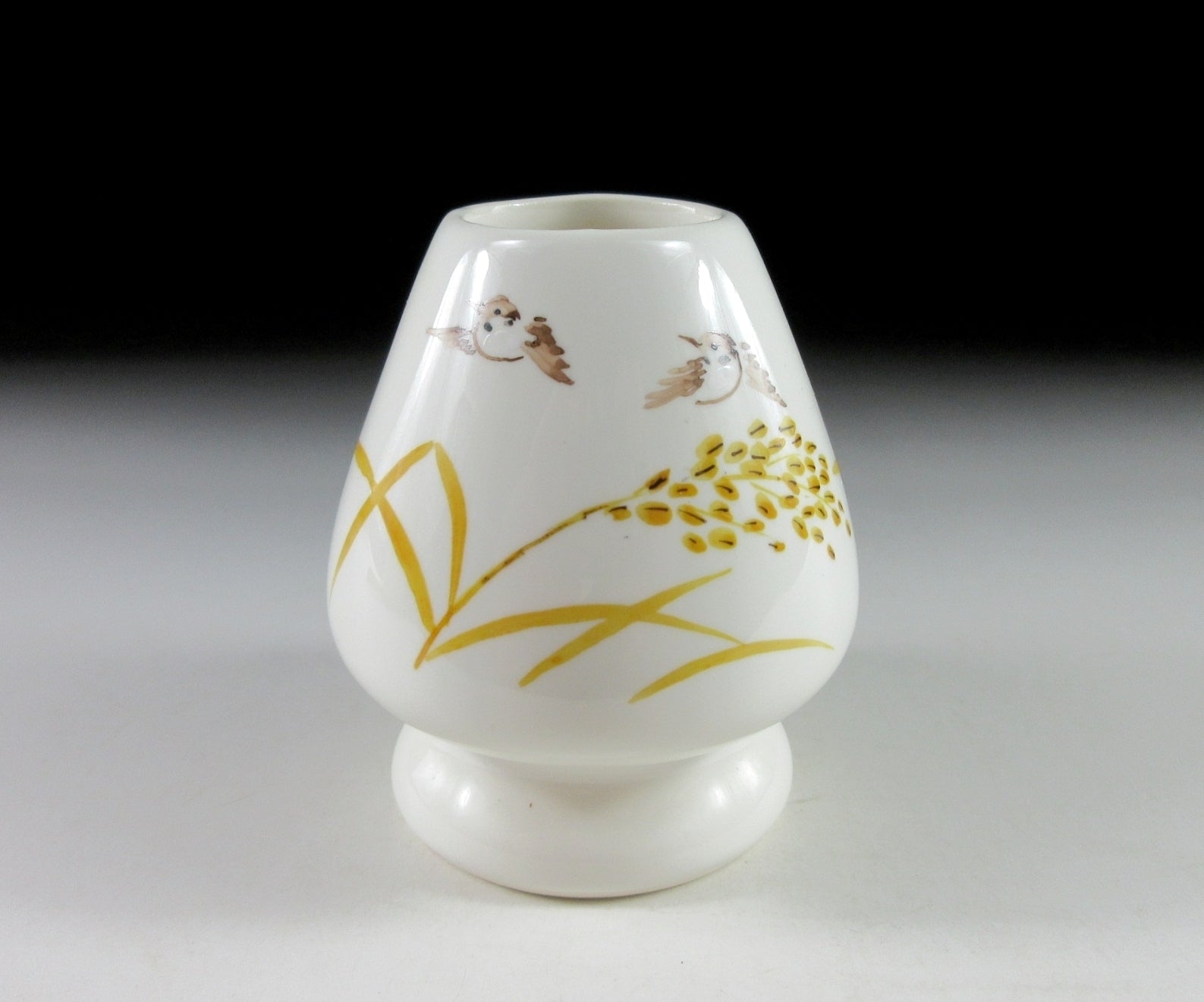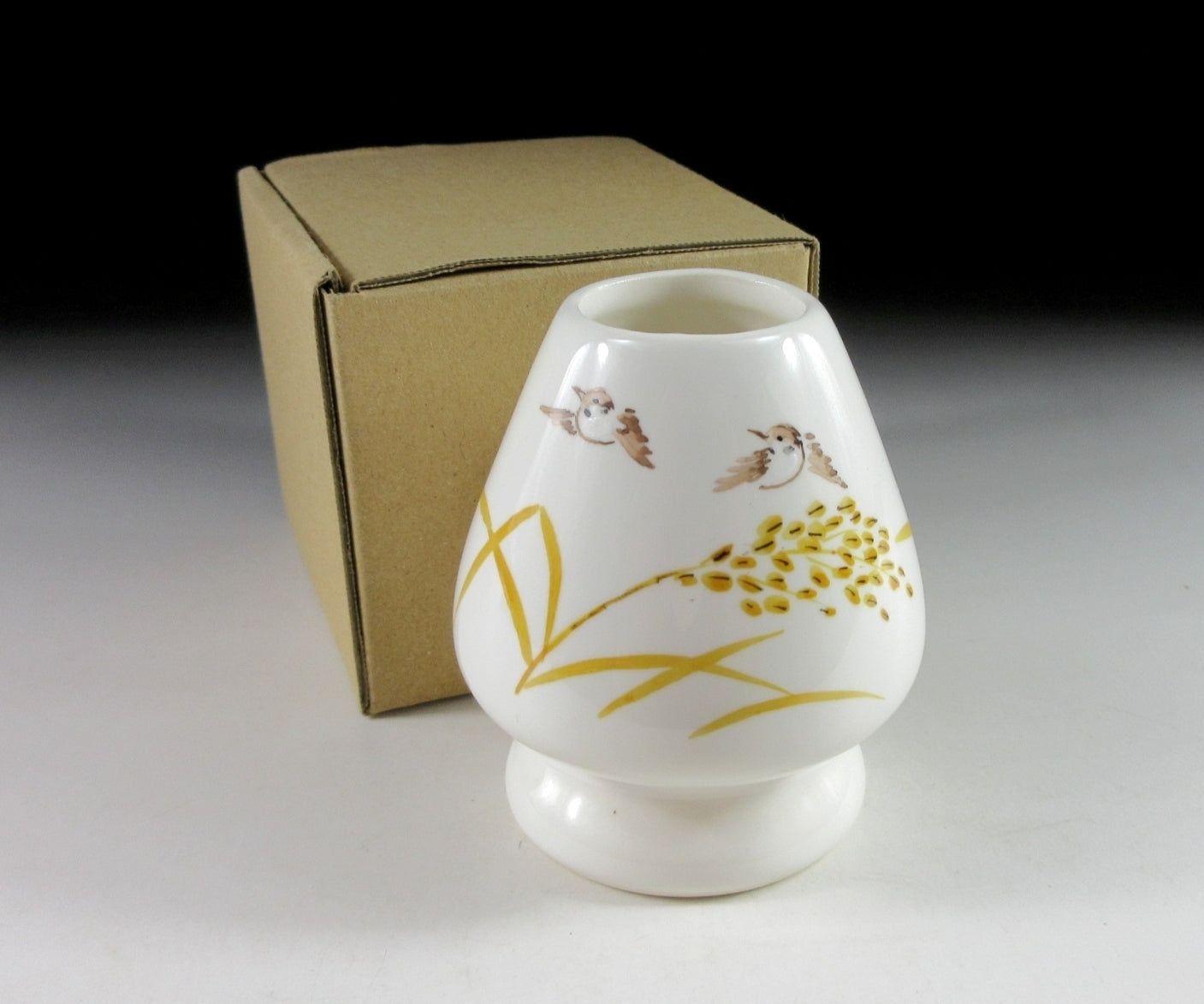 This listing is for a hand-painted chasen tea whisk shaper made by noted potter, Yagi Kaiho. The shaper’s job is to help your chasen maintain its shape whilst drying. After the tea whisk is dried it should be stored in a chasen zutsu. Care should be taken when placing your chasen on the shaper. Not placing the tines properly may result in broken ends. The shaper in this listing has a nice smooth surface which won’t snag the tines on your tea whisk, and it's decorated with two sparrows among ears of rice. It’s a beautifully decorated piece for the autumn season.