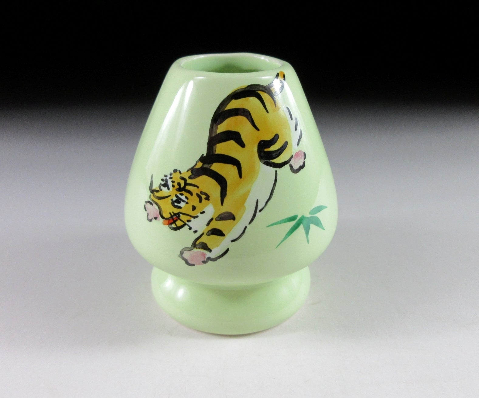 This listing is for a hand-painted chasen tea whisk shaper made by noted potter, Yagi Kaiho. The shaper’s job is to help your chasen maintain its shape whilst drying. After the tea whisk is dried it should be stored in a chasen zutsu. Care should be taken when placing your chasen on the shaper. Not placing the tines properly may result in broken ends. The shaper in this listing has a nice smooth surface which won’t snag the tines on your tea whisk, and it features a hand-painted tiger over a green base. This particular item is for use during the Year of the Tiger, and comes with a paper storage box.