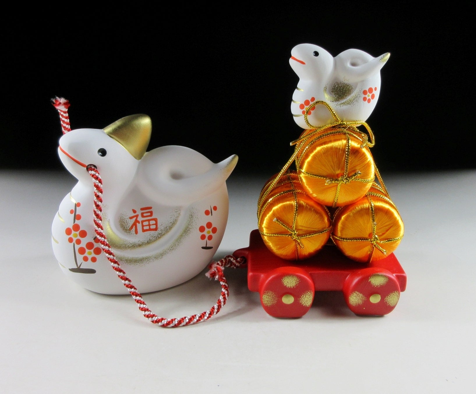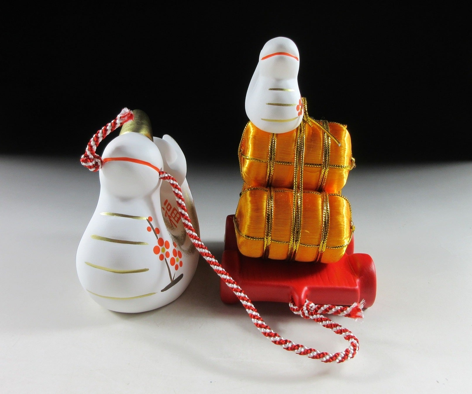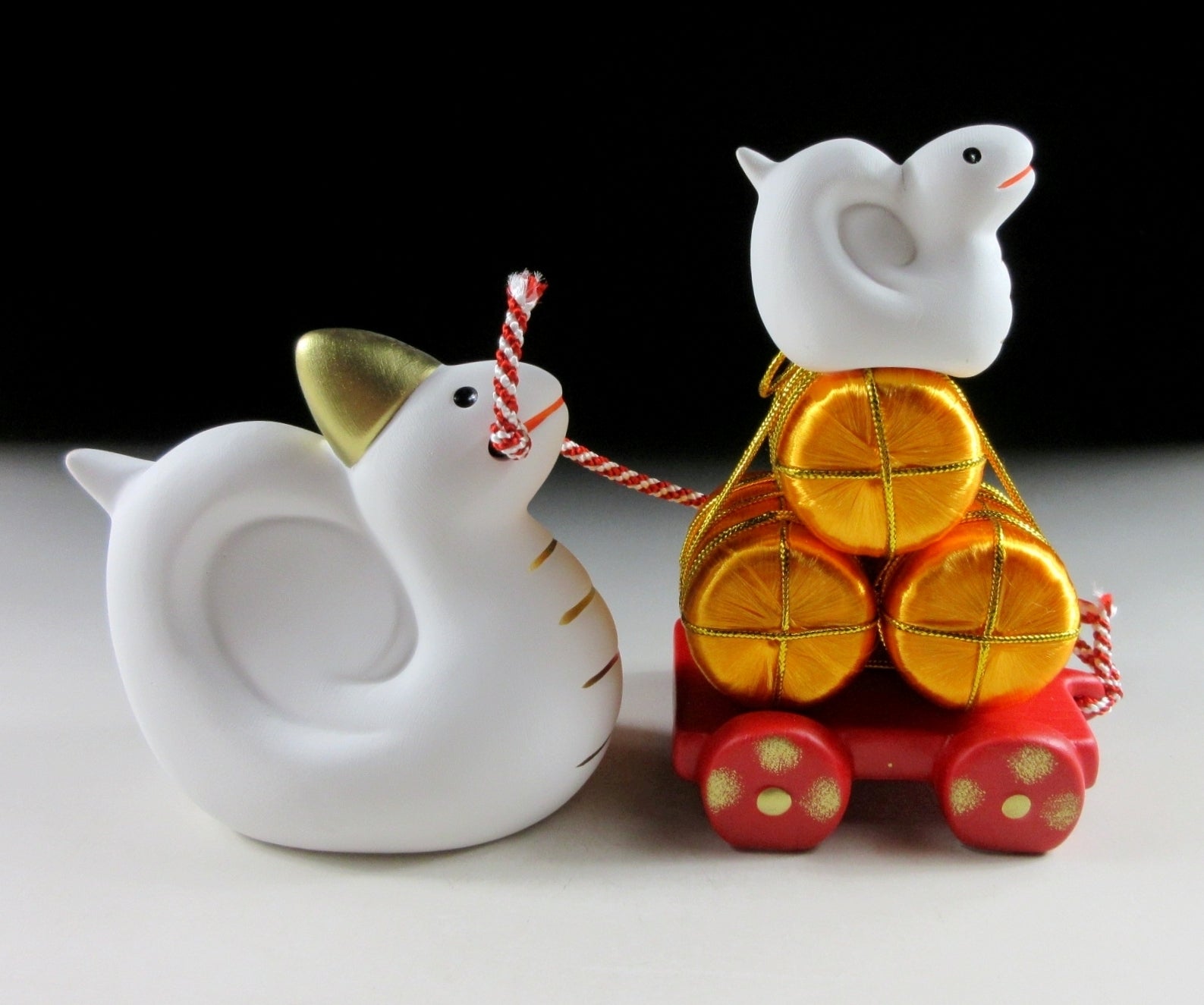 This listing is for a new year okimono made by Yakushi Gama. It is made from a slip mould and moulded to resemble a snake pulling a cart loaded with golden rice bales. There’s a small snake perched on top of the bales, and the larger snake is decorated with the kanji for luck. White snakes are considered to be good luck in Japan, and are a symbol for Benten, the Japanese goddess of wealth. This piece also comes with a plastic display board, and gold byobu screen made of thin cardboard, a small wooden plaque, and its original paper storage box.