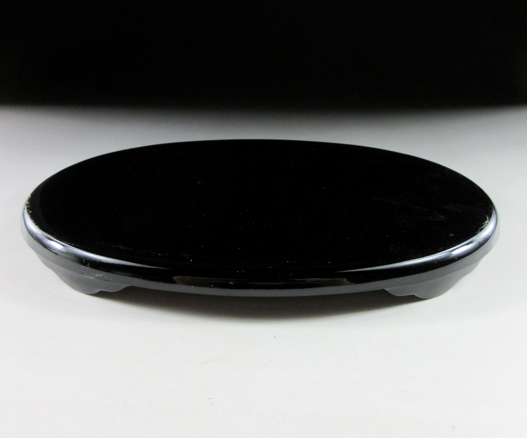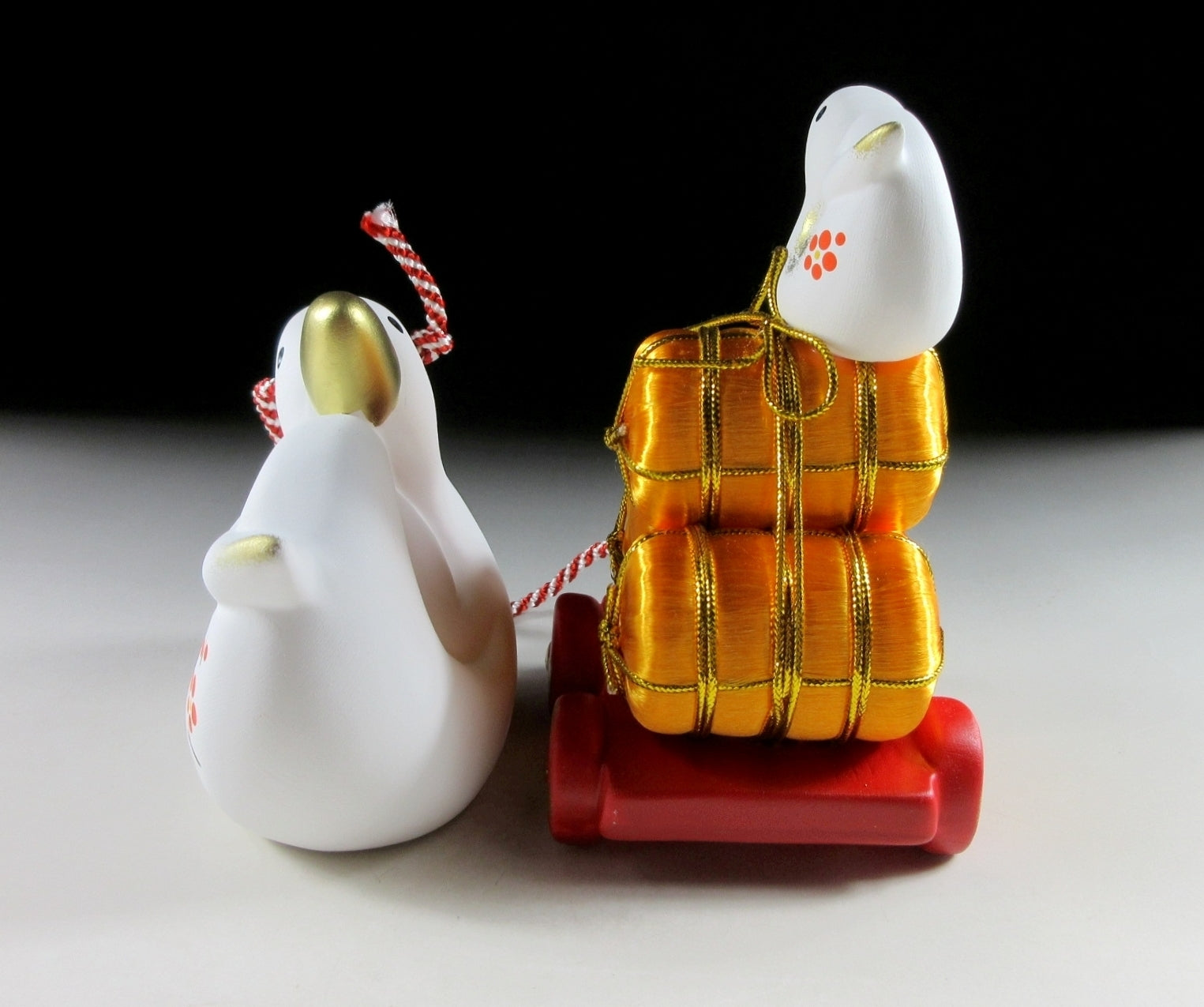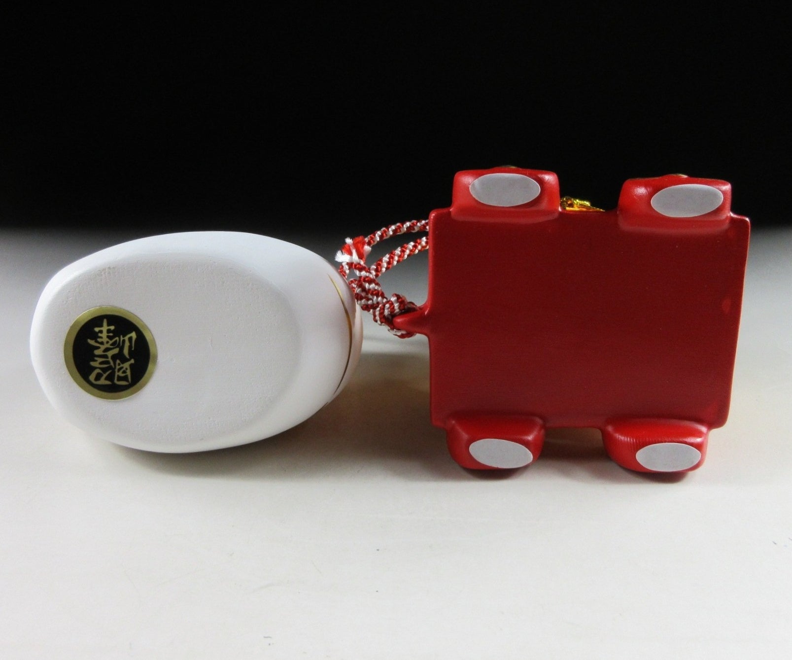 This listing is for a new year okimono made by Yakushi Gama. It is made from a slip mould and moulded to resemble a snake pulling a cart loaded with golden rice bales. There’s a small snake perched on top of the bales, and the larger snake is decorated with the kanji for luck. White snakes are considered to be good luck in Japan, and are a symbol for Benten, the Japanese goddess of wealth. This piece also comes with a plastic display board, and gold byobu screen made of thin cardboard, a small wooden plaque, and its original paper storage box.