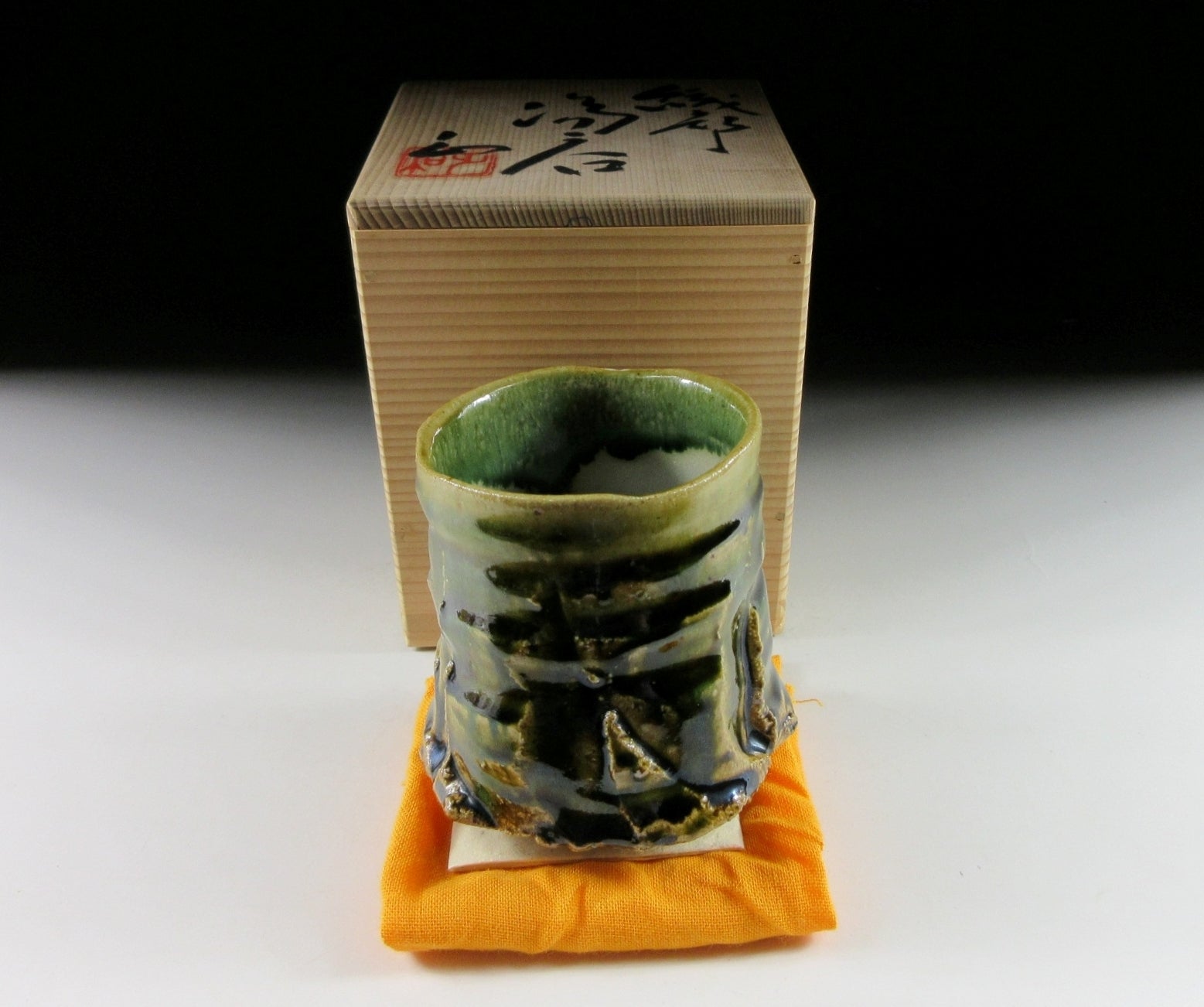 This listing is for a Mino-ware yunomi made around 10 years ago by Yamada Masakazu. It is made of high-fired stoneware coated in green oribe glaze, and the exterior has a beautiful tactile surface. This piece is not so large, please check the measurements carefully before ordering. The signature of the potter can be found on the bottom, and it comes with its original signed wooden storage box. It also comes with a turmeric coloured wrapping cloth for when the item is not in use, and a Japanese language profile paper.