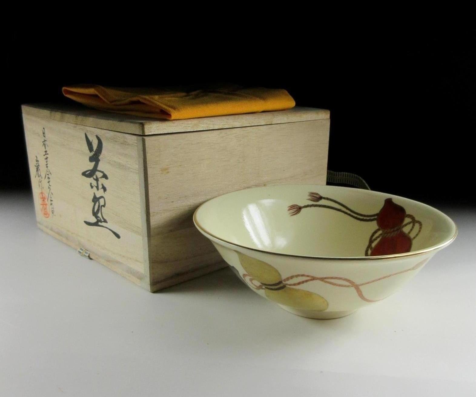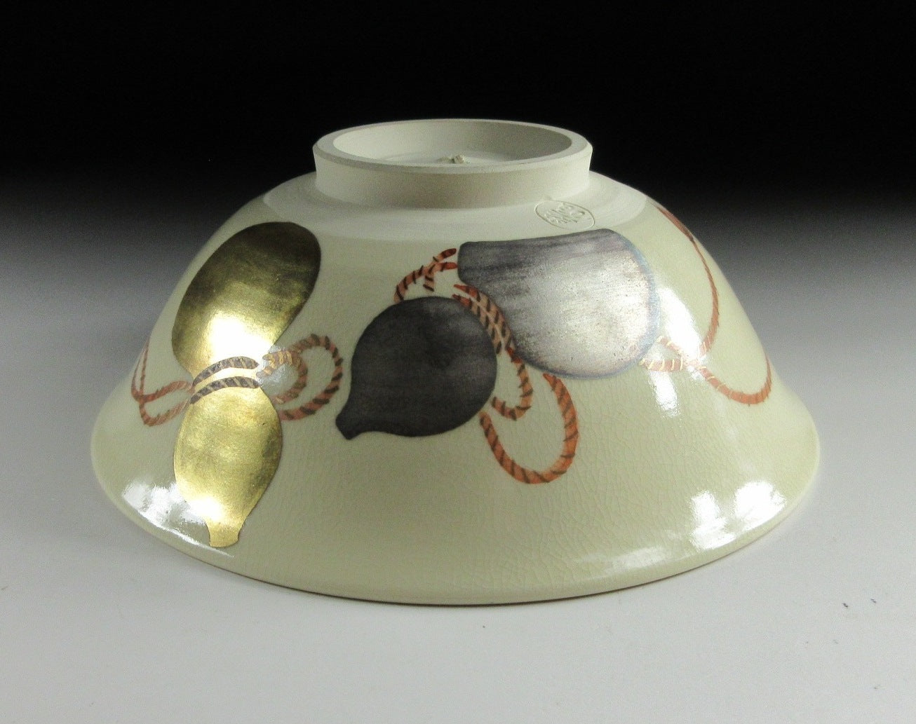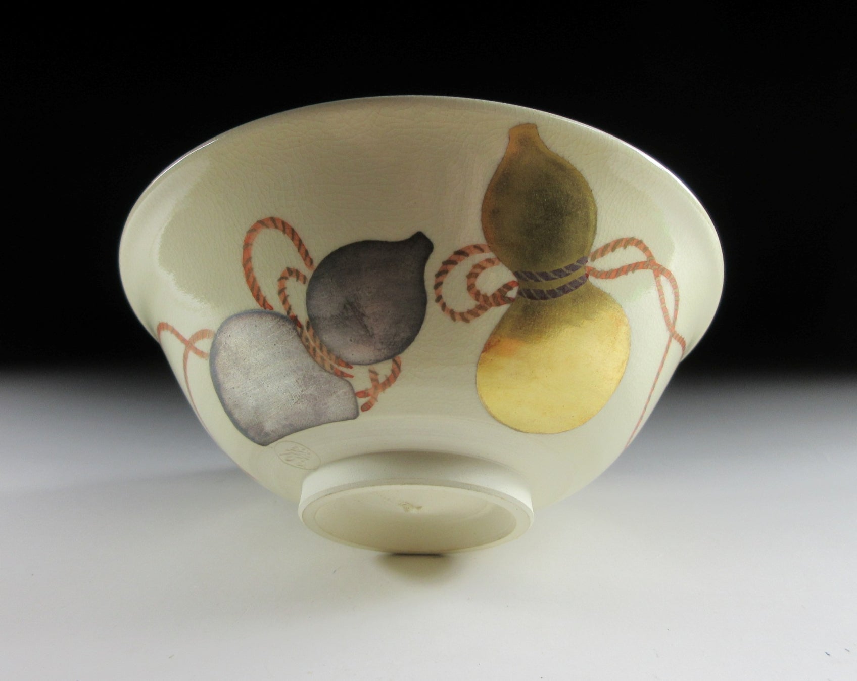 This listing is for a pleasant Kyo-ware chawan made around 20 years ago by noted potter, Yamakawa Iwao III. It is wheel-thrown and the flat hira type used during the summer season. Hira chawan are shallow bowls with low sides designed to cool tea down faster. The bowl in this listing is decorated with hand-painted gourds. The gourd, or hyotan as it is known in Japanese, is an auspicious symbol linked to longevity and fertility. Traditionally households grew gourds to use as flasks or containers, however the vines were also used to provide shade during the stifling summer heat. Gourds were also used as seed containers, and older Japanese will tell you that seeds kept in such containers were always fruitful. The stamp of the potter can be found on the bottom, and it comes with its original signed wooden storage box. It also comes with a stamped turmeric coloured wrapping cloth for when the item is not in use.