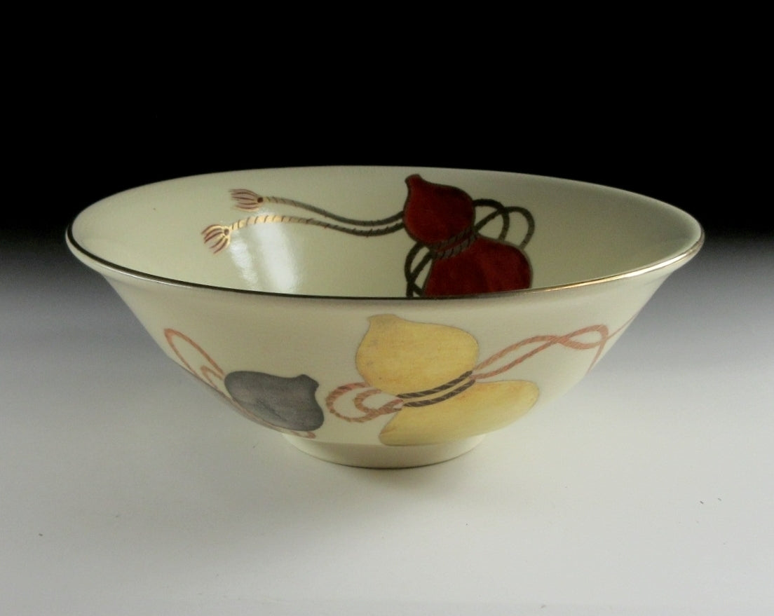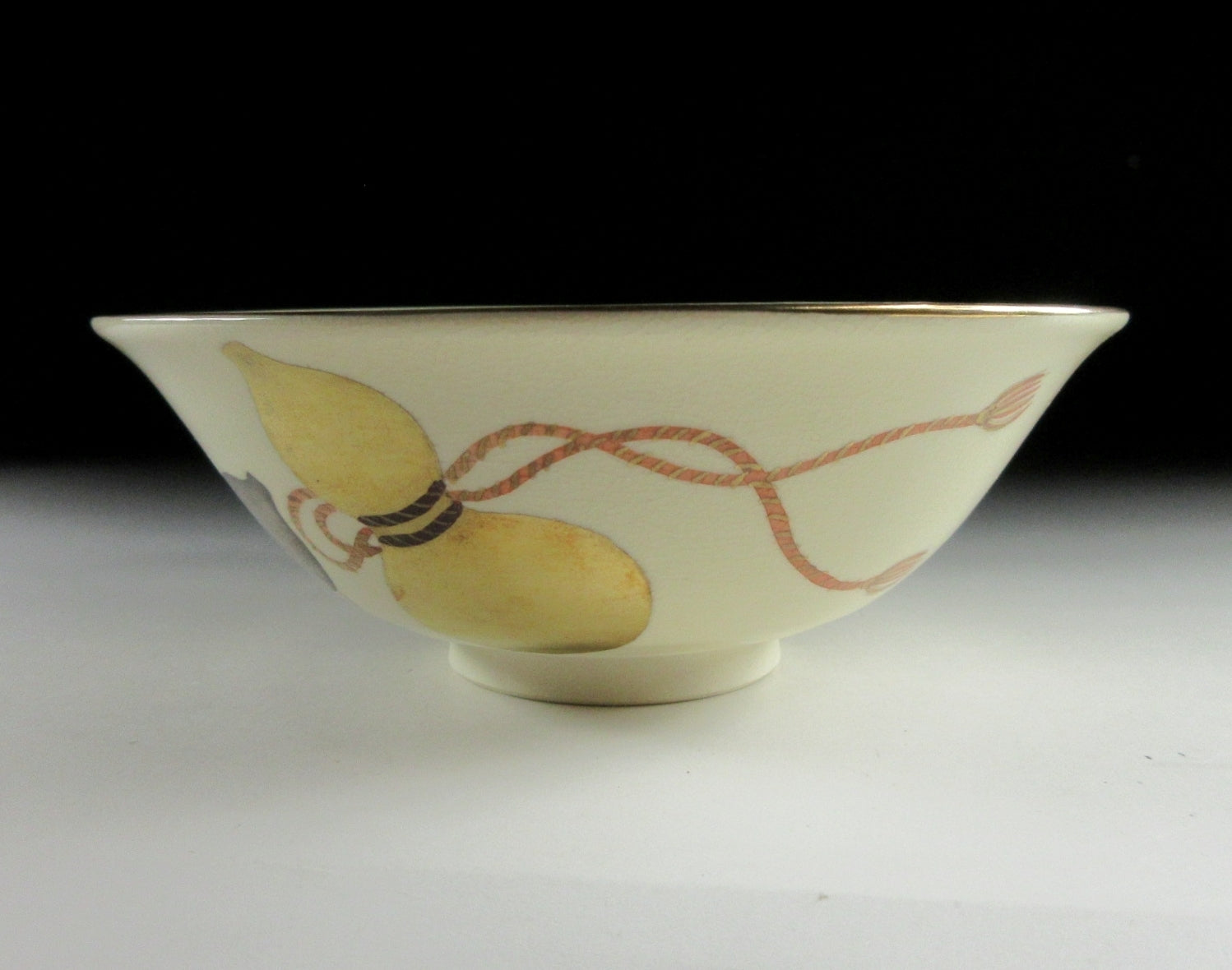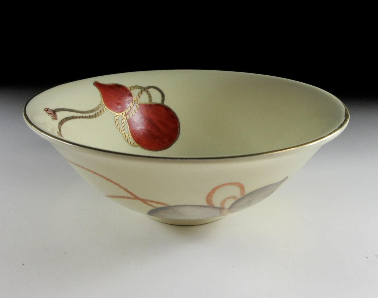 This listing is for a pleasant Kyo-ware chawan made around 20 years ago by noted potter, Yamakawa Iwao III. It is wheel-thrown and the flat hira type used during the summer season. Hira chawan are shallow bowls with low sides designed to cool tea down faster. The bowl in this listing is decorated with hand-painted gourds. The gourd, or hyotan as it is known in Japanese, is an auspicious symbol linked to longevity and fertility. Traditionally households grew gourds to use as flasks or containers, however the vines were also used to provide shade during the stifling summer heat. Gourds were also used as seed containers, and older Japanese will tell you that seeds kept in such containers were always fruitful. The stamp of the potter can be found on the bottom, and it comes with its original signed wooden storage box. It also comes with a stamped turmeric coloured wrapping cloth for when the item is not in use.