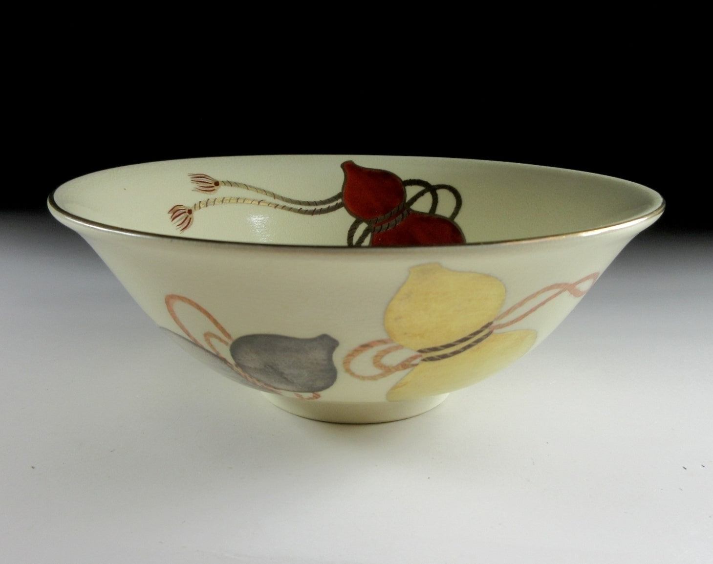 Kyo-ware originated in the 17th century in Kyoto and features overglaze enamel pigments on a porcelain base. The porcelain base acts as white canvas, allowing for beautiful and superior quality designs to be painted. Kyo-ware artisans traditionally produced chawan and utensils for the tea ceremony, however contemporary potters specialize in tableware, tea ceremony items, incense holders, and okimono. Kyo-ware was designated as a traditional craft in 1977.