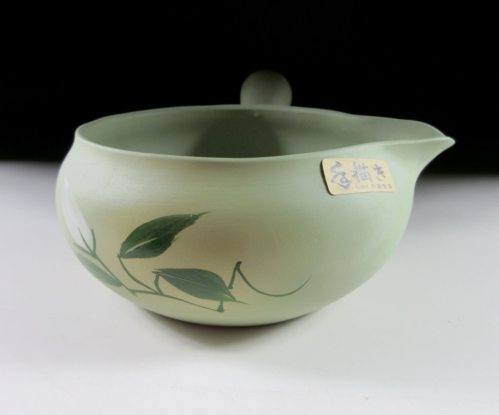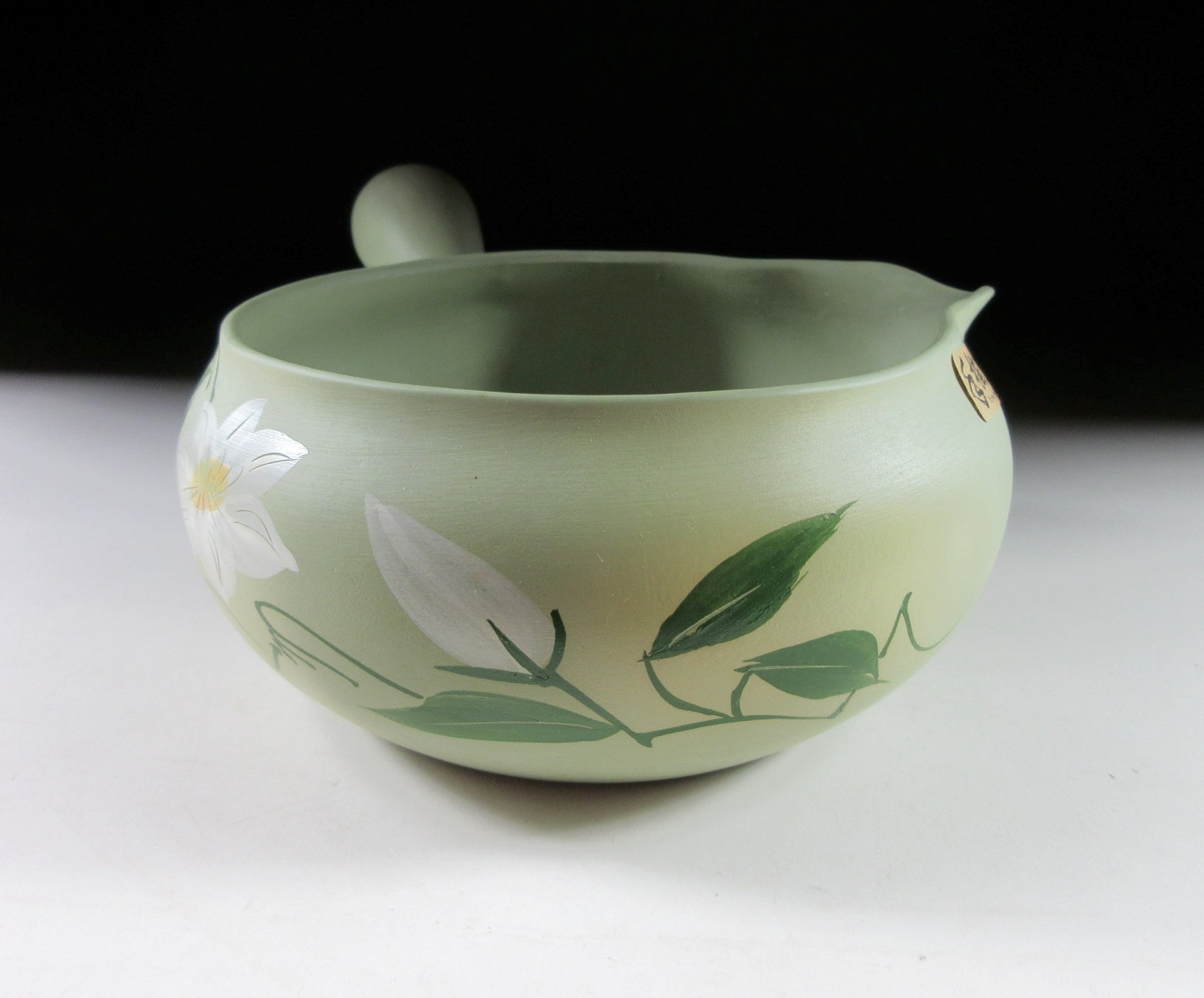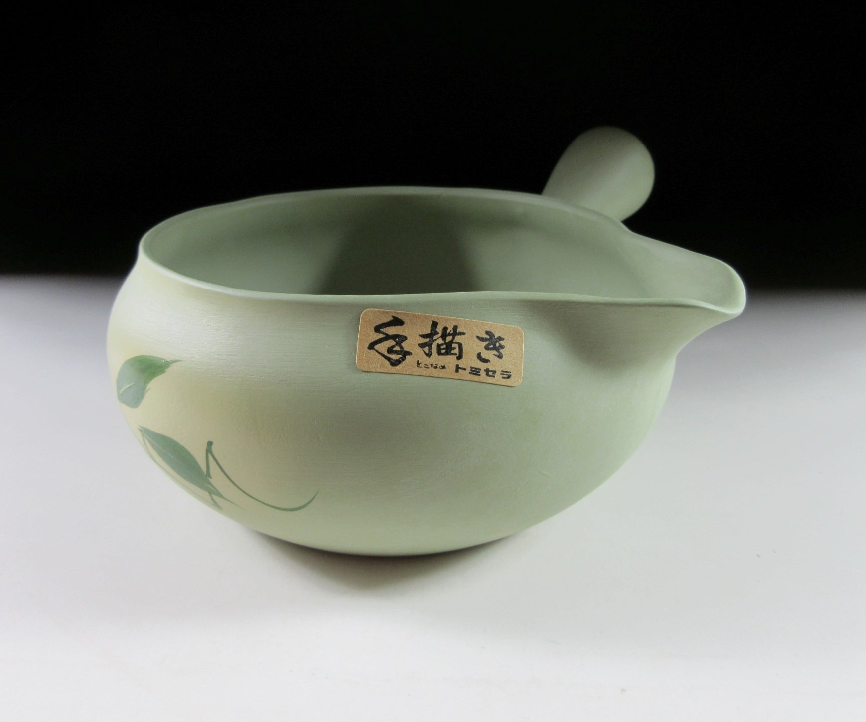 This listing is for a reasonably large Tokoname-ware yuzamashi made around 30-40 years ago for the Yamaki Ikai brand of tableware and teaware. It is made from a slip mould and the front is decorated with white daylilies over a pale green background. It holds 500ml when full but the recommendation is to serve between 300-400ml when preparing tea. Tokoname clay contains a lot of iron oxide, and this reacts with the tannin and removes any bitterness resulting in a more mellow flavour. This piece comes with its original paper storage box, as well as Japanese language instructions for using and storing the yuzamashi.