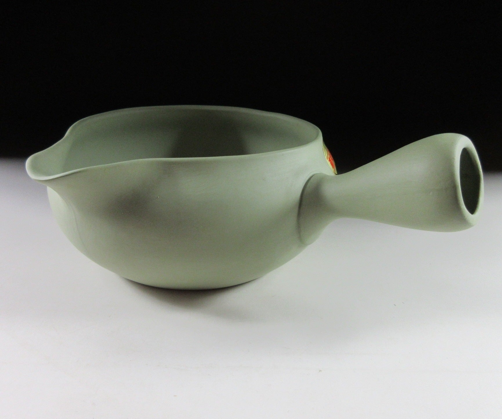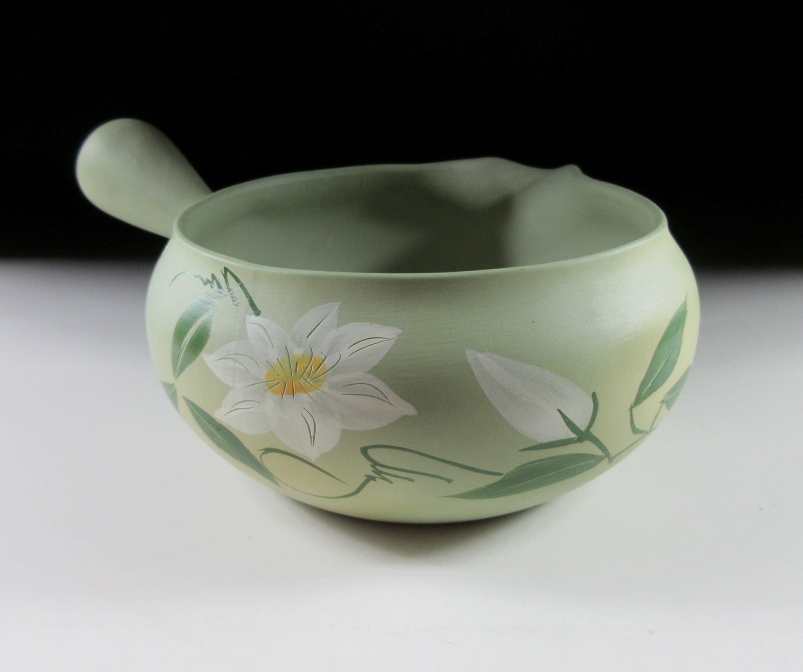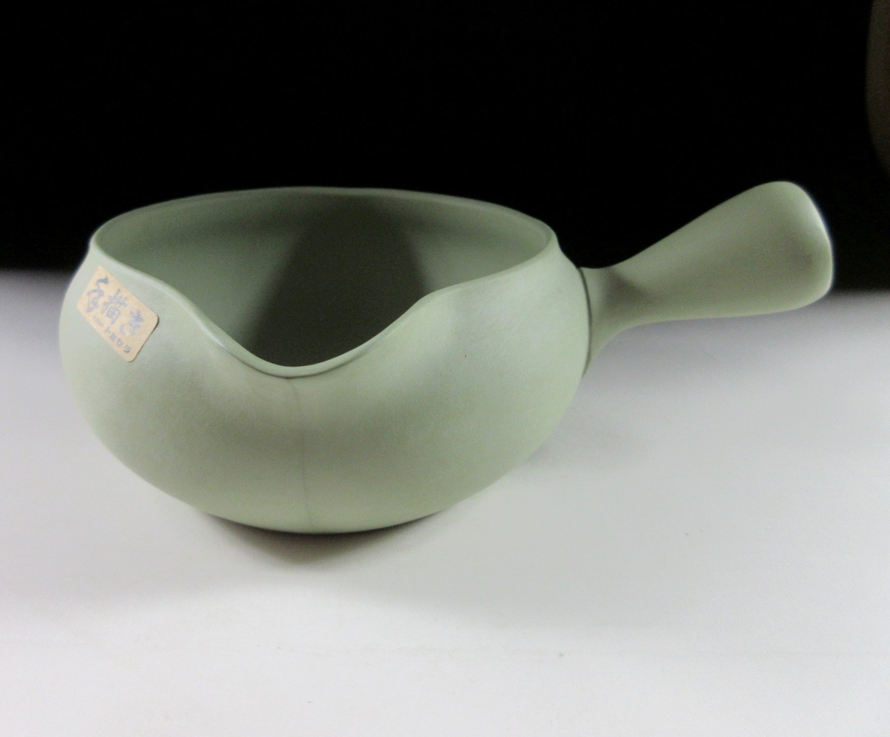 This listing is for a reasonably large Tokoname-ware yuzamashi made around 30-40 years ago for the Yamaki Ikai brand of tableware and teaware. It is made from a slip mould and the front is decorated with white daylilies over a pale green background. It holds 500ml when full but the recommendation is to serve between 300-400ml when preparing tea. Tokoname clay contains a lot of iron oxide, and this reacts with the tannin and removes any bitterness resulting in a more mellow flavour. This piece comes with its original paper storage box, as well as Japanese language instructions for using and storing the yuzamashi.