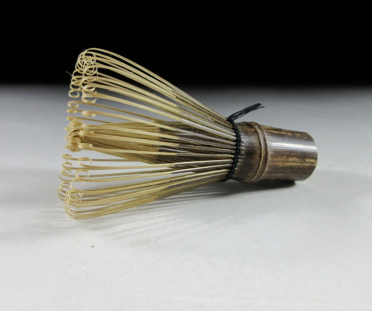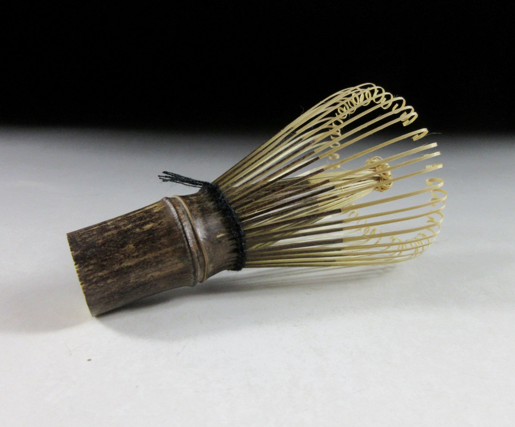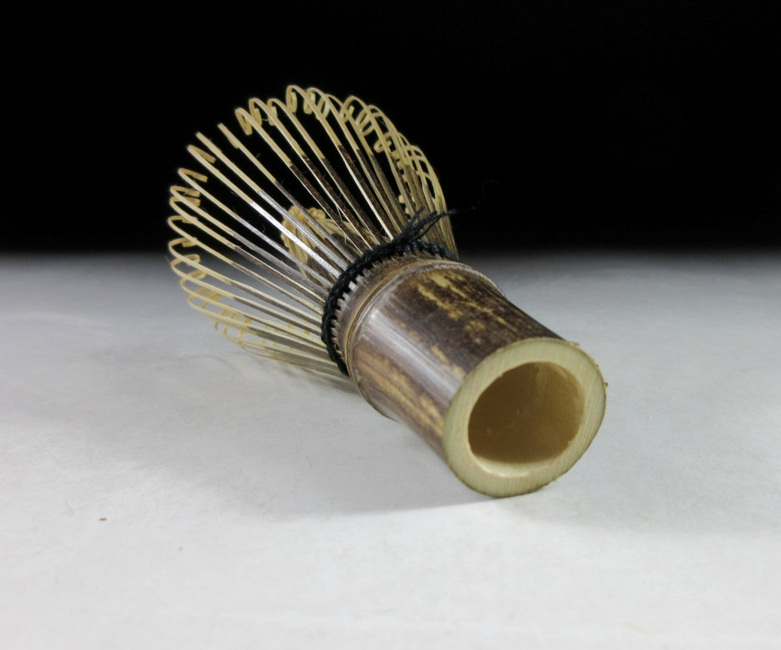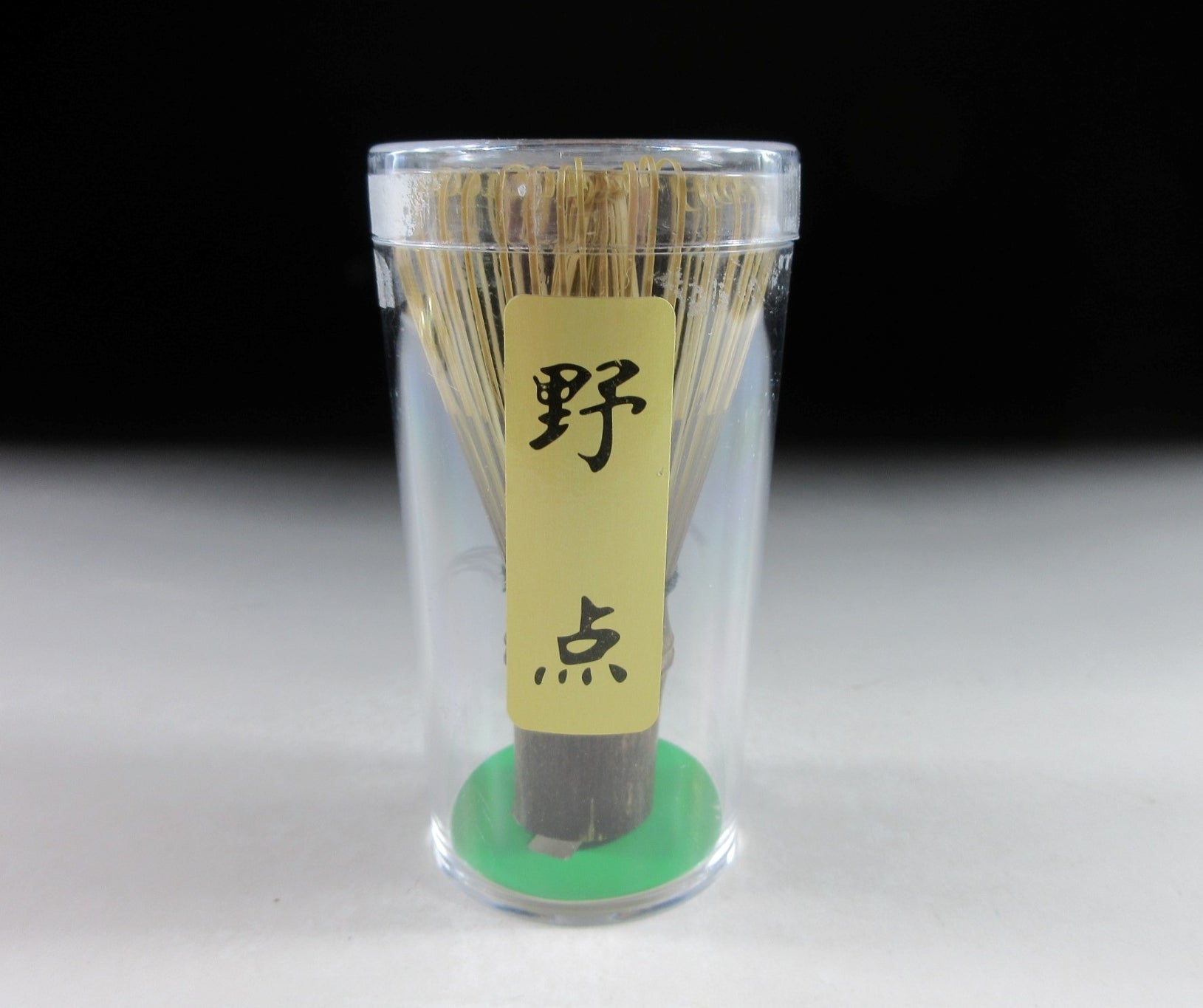 This listing is for a black bamboo nodate chasen made by Yamamoto Takizayikuya. The chasen is tulip shaped and split from one piece of bamboo into 100 small prongs. The 100 tine type is popular because more prongs result in more foam and a better frothy texture. Nodate chasen are smaller than regular size chasen and are intended for outdoor tea ceremony, we have included a photo so you can compare sizes. It comes with a plastic storage case, please note that this particular whisk is produced at Yamamoto Takizayikuya’s workshop in China.