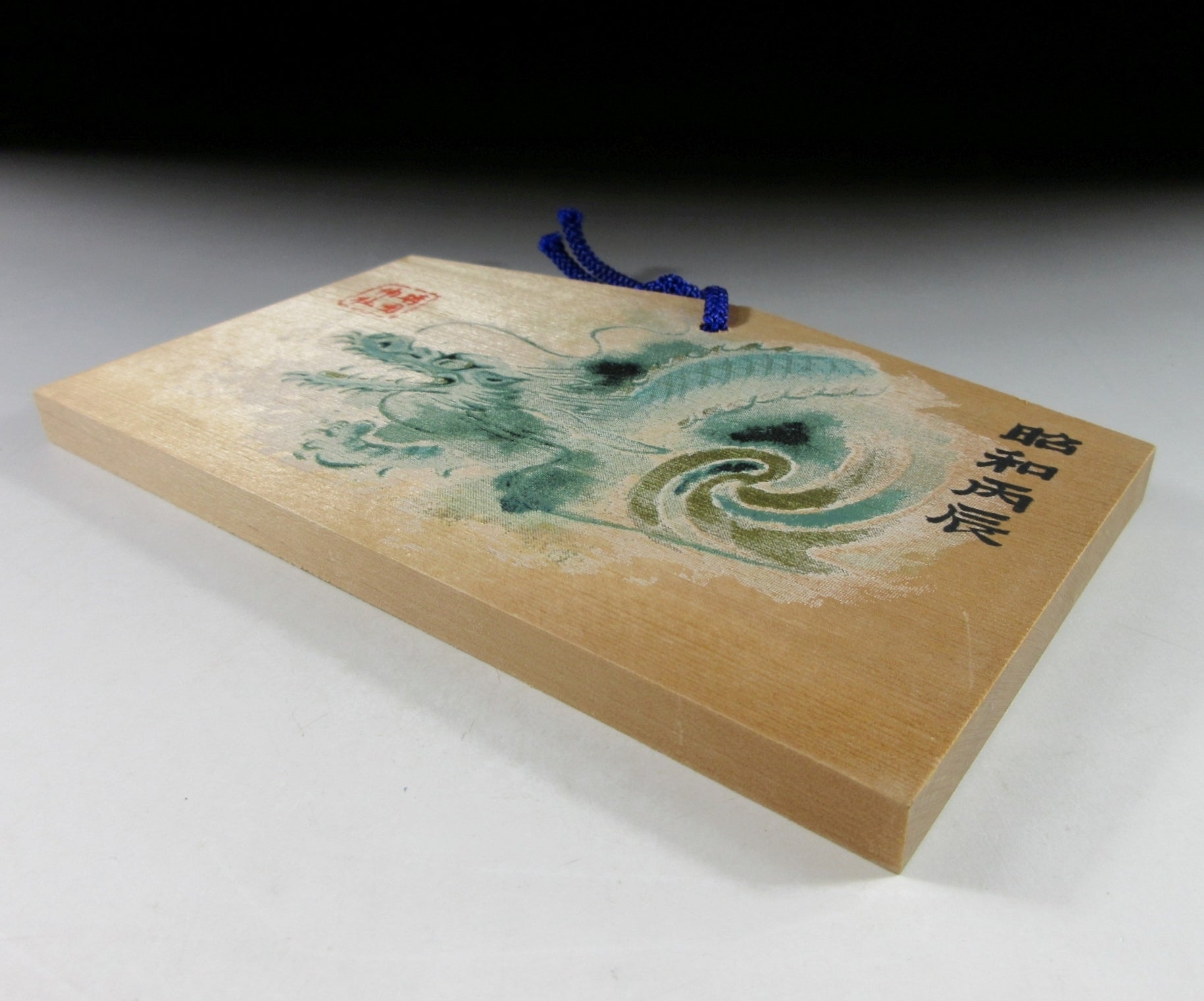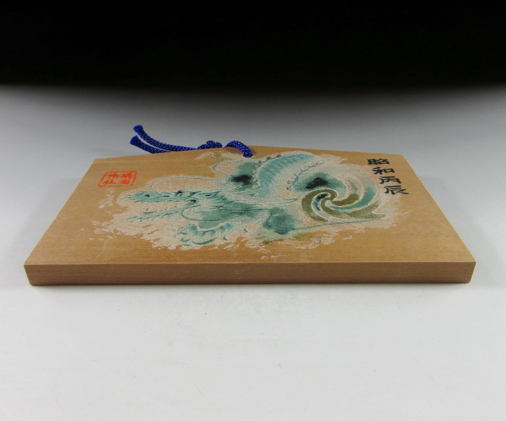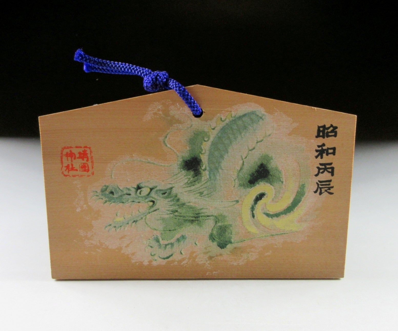 This listing is for a wooden ema dating back to Showa 63 (1988). The red writing on the left says Yasukuni Shrine, and the black writing on the right refers to the Year of the Dragon in 1988. Yasukuni is a Shinto-style shrine commemorating Japan’s war dead, and it is also famous for being the first place in Tokyo for the cherry blossoms to open. This shrine is also a very popular choice for the ritual first shrine visit of the year.