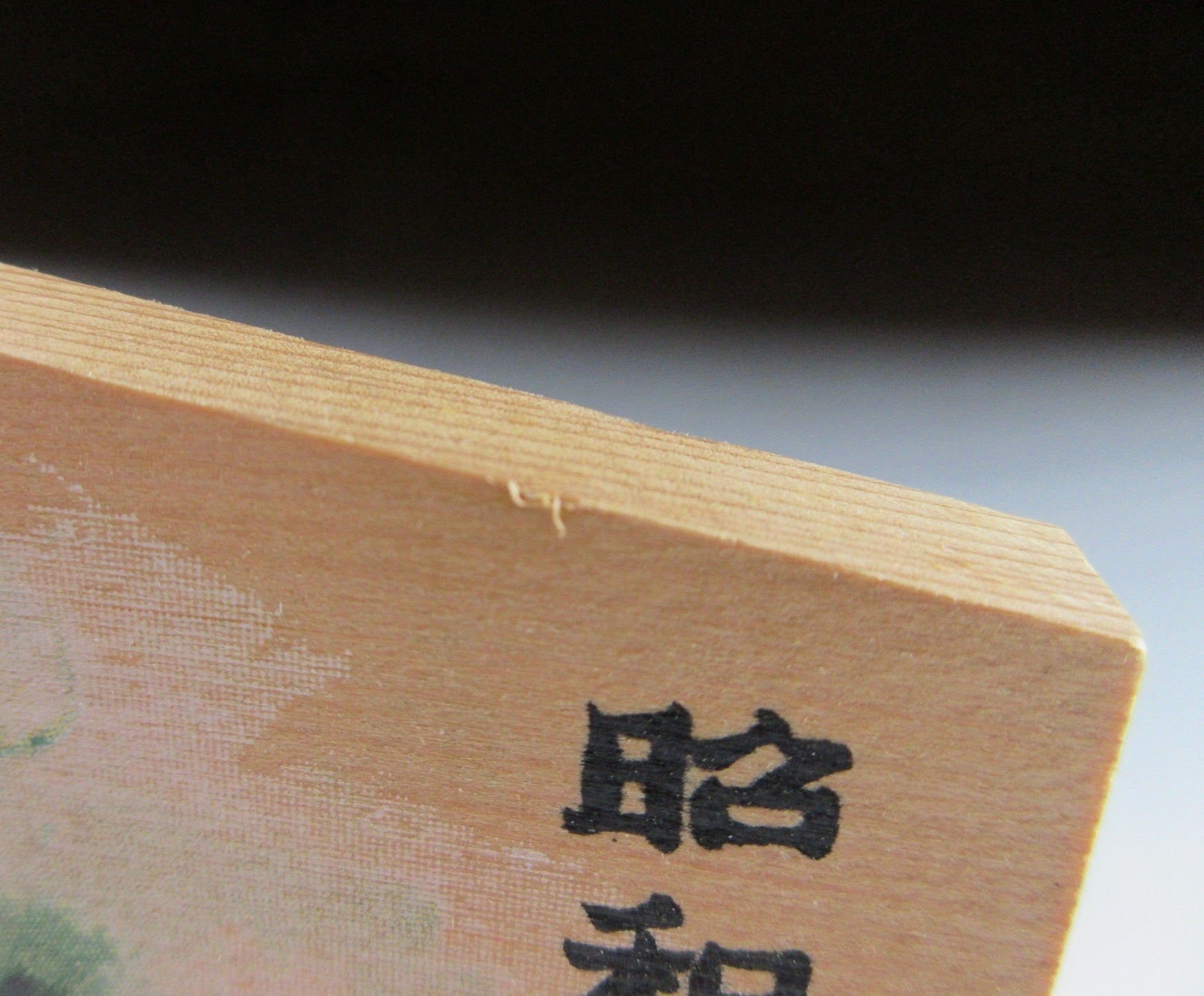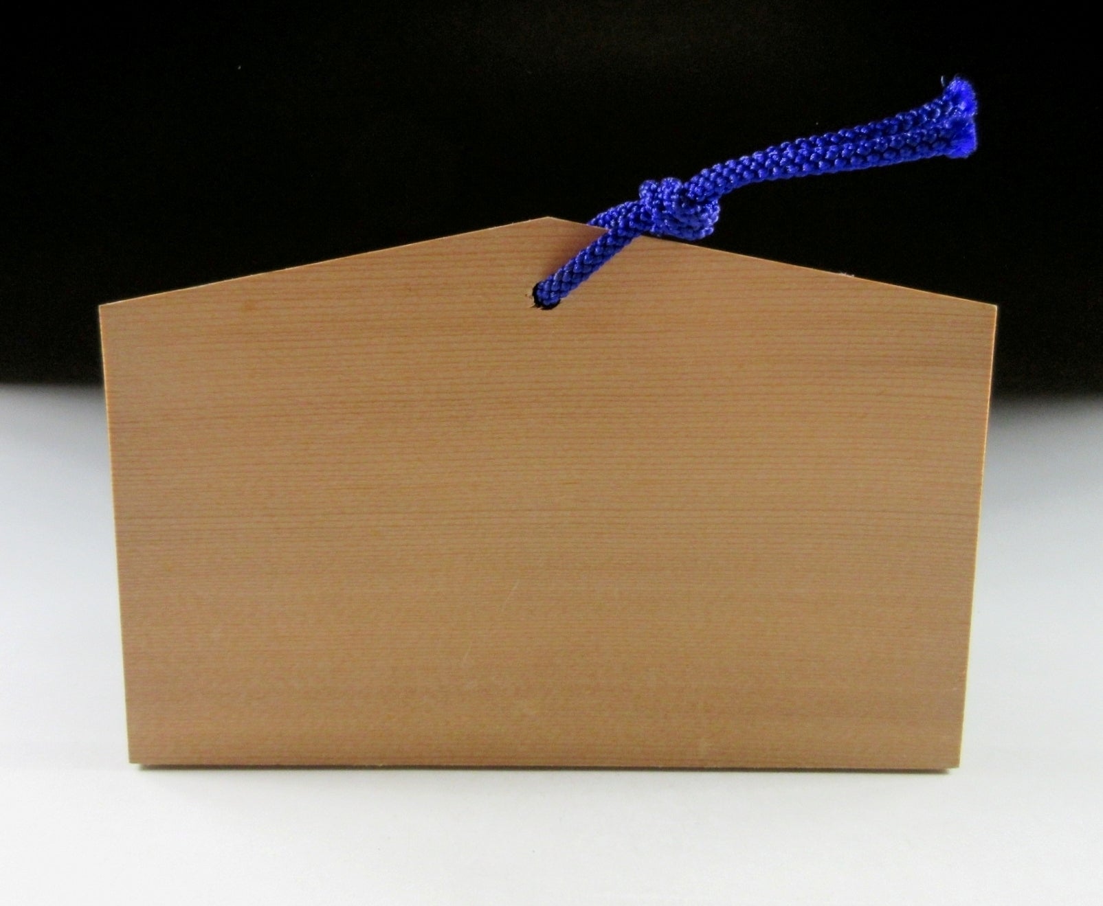 An ema is a traditional wooden votive prayer on which Shinto and Buddhist worshippers inscribe their wishes or prayers. Ema typically depict figures and zodiac animals, and they are hung at shrines and temples in the hope that the gods receive them and answer their prayers. The very first ema were said to be painted pictures of horses which were offered to shrines in place of real horses. The tradition of donating horses goes back to one of the first emperors of Japan, down in Kyoto. This was done to appease the gods when the weather wasn’t cooperating – a white horse was given to ease unseasonably heavy rainfall, and a black horse was offered to curb a drought. Traditionally ema were very large in size and often painted by well-known artists and craftsmen. During the Edo period they began to change in size due to the number of ordinary people travelling around the country visiting shrines and temples. These everyday folks were not so wealthy so shrines began to offer small wood framed ema as an alternative. This particular type were either hand painted by artists, or by those commissioned by the shrine. Sadly not many remain as most of them were burned in ritual fires at the end of each year.