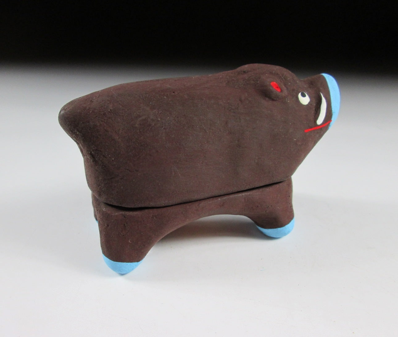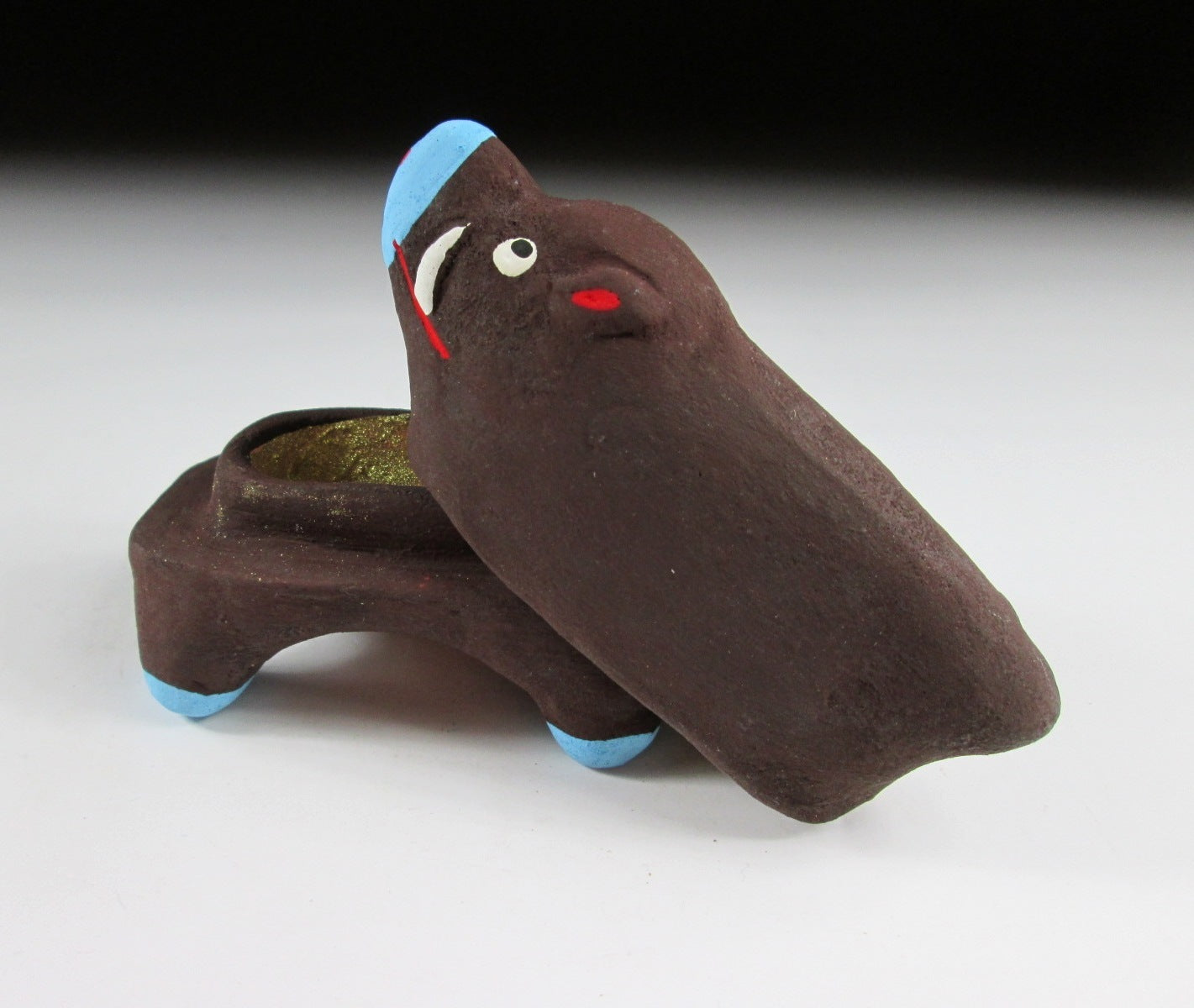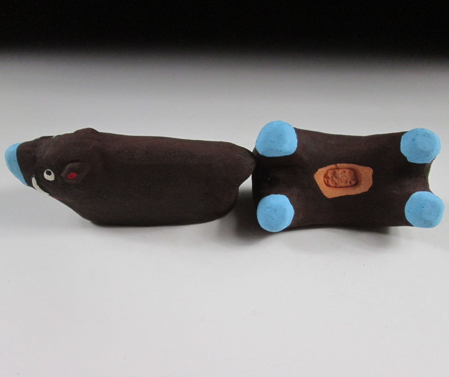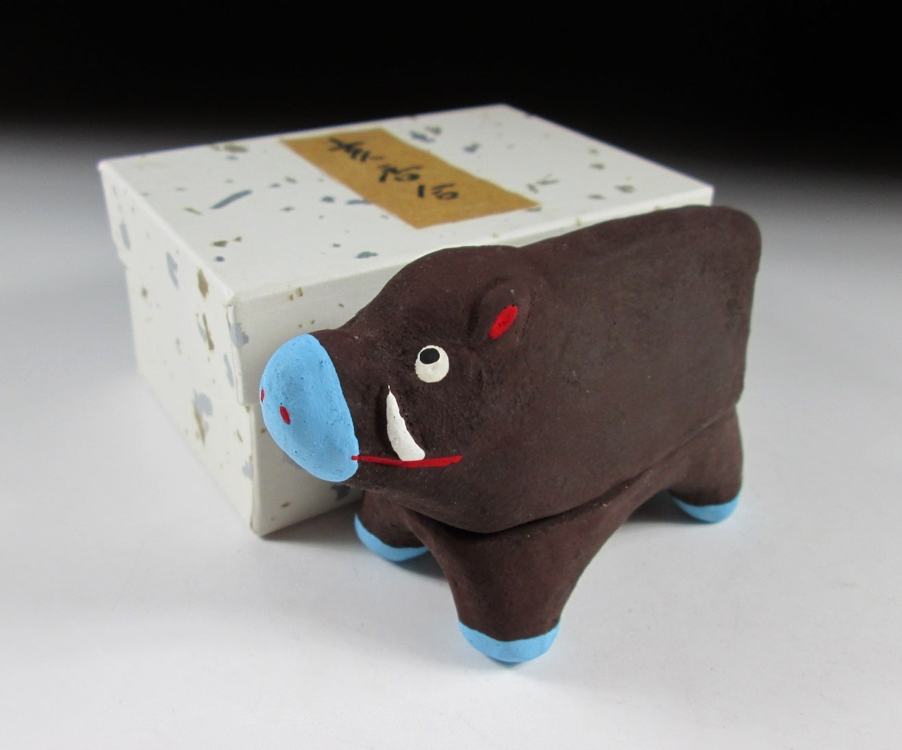 This listing is for an earthenware Kyo-ware boar kogo made around 20 years ago. It is hand-painted with dark brown gesso, with blue, red and white trim for the facial features and hooves. The interior is painted gold, and its suitable for holding both woodchip and kneaded incense, although pottery kogo are typically used for kneaded incense during the cooler months. This piece was most likely made to commemorate the Year of the Boar back in 1995. It comes with its original paper storage box.