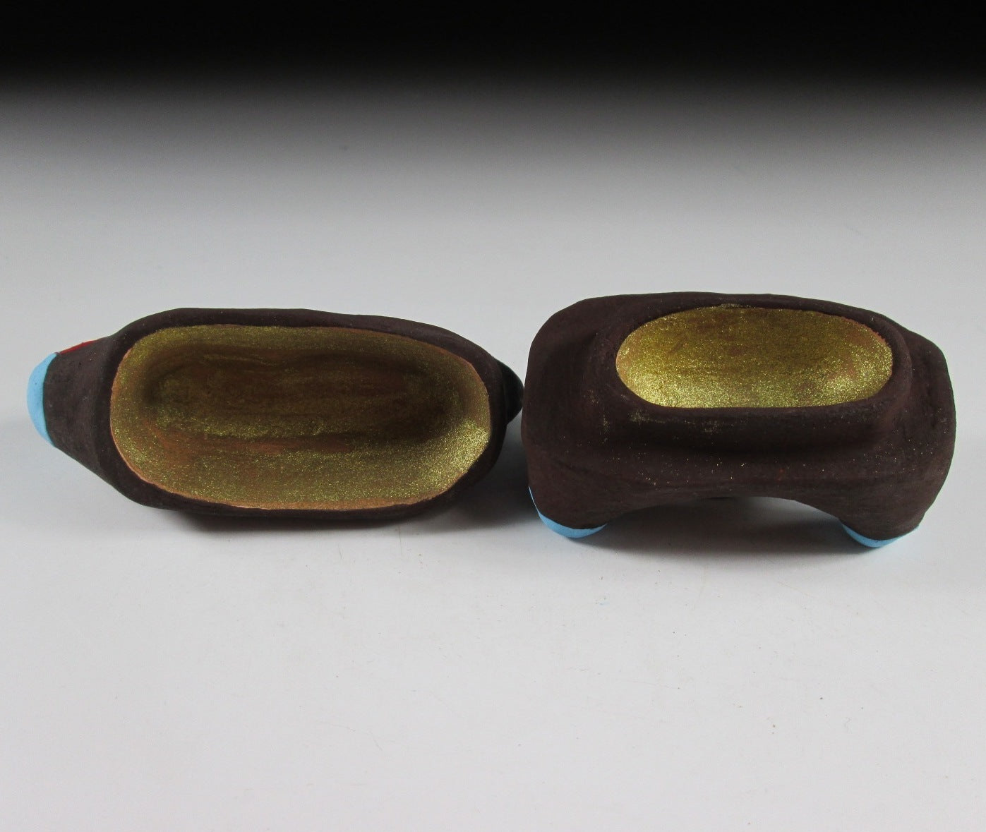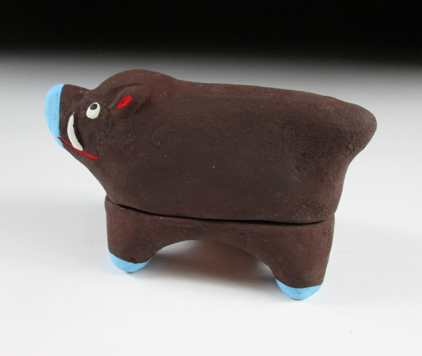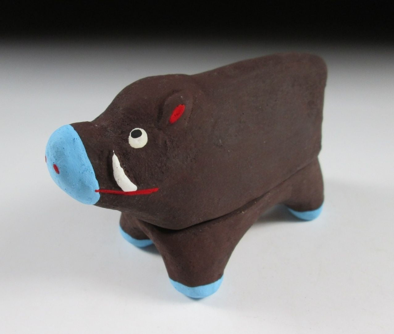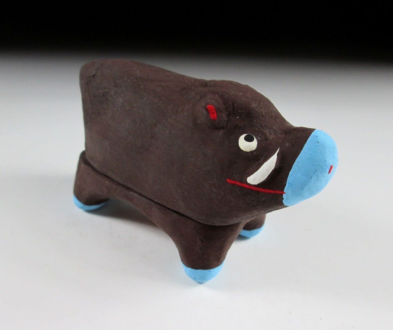 This listing is for an earthenware Kyo-ware boar kogo made around 20 years ago. It is hand-painted with dark brown gesso, with blue, red and white trim for the facial features and hooves. The interior is painted gold, and its suitable for holding both woodchip and kneaded incense, although pottery kogo are typically used for kneaded incense during the cooler months. This piece was most likely made to commemorate the Year of the Boar back in 1995. It comes with its original paper storage box.