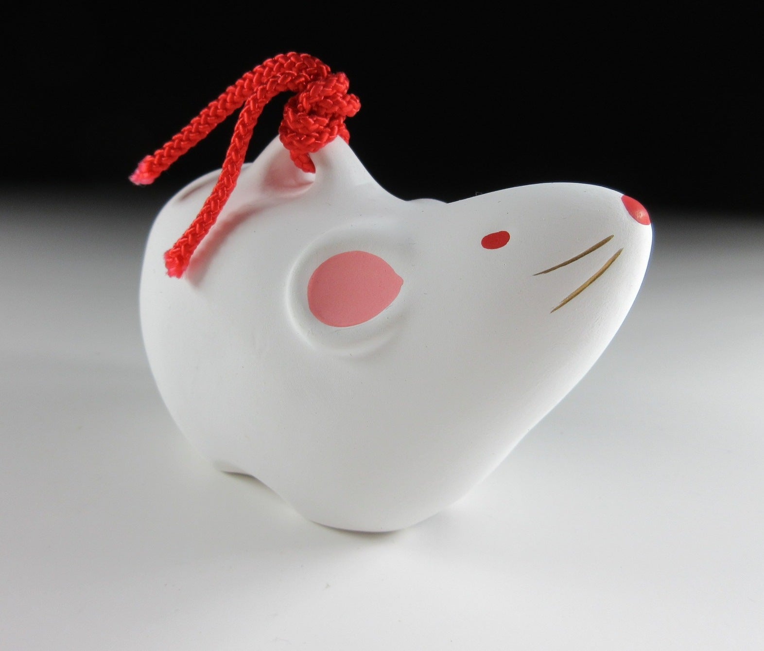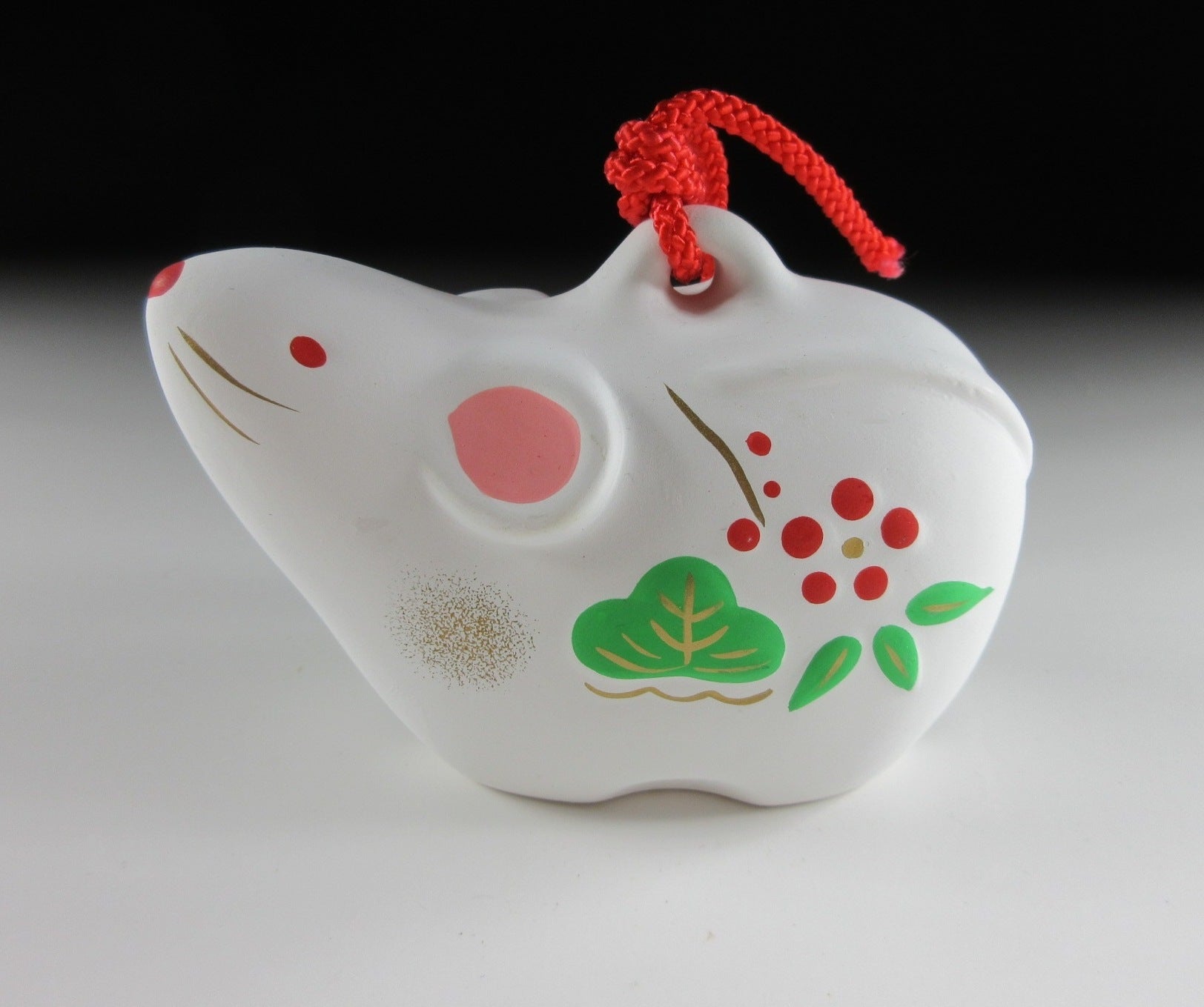 This listing is for a vintage rat bell made around 15 years ago. It is made of earthenware and painted with white matte gesso and decorated with the three friends of winter. Bamboo, matsu pine and ume are admired in both Japan and China as they do not wither against the cold of winter. All three plants are regarded as auspicious and are believed to symbolise endurance and strength. The bell has a small loop and red string attached to the top to enable easy handling. It was most likely made to commemorate the Year of the Rat back in 2008.