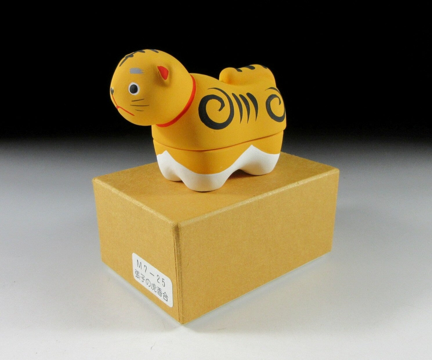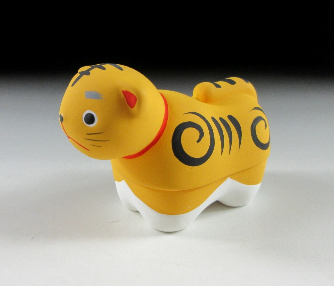 This listing is for an adorable Kyo-ware kogo made around 20 years ago. It is moulded to resemble a tiger, and hand-painted with bright yellow matte finish gesso. Its size and shape is suitable for holding both woodchip and kneaded incense, although pottery kogo are typically used for kneaded incense during the cooler months. The stamp of the potter can be found on the bottom, and it comes with its original paper storage box. This piece was most likely made to commemorate the Year of the Tiger back in 2010.