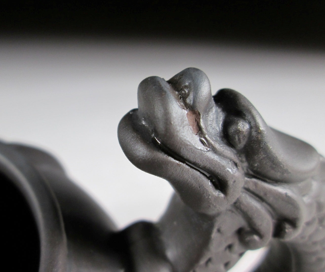 This listing is for a small production-ware Yixing style teapot made around 20 years ago. It has a smooth ‘purple zisha’ finish and it’s moulded to resemble a majestic dragon. It has a capacity of 275ml, and there’s a built-in strainer over the spout area. The stamp of the kiln can be found on the bottom.