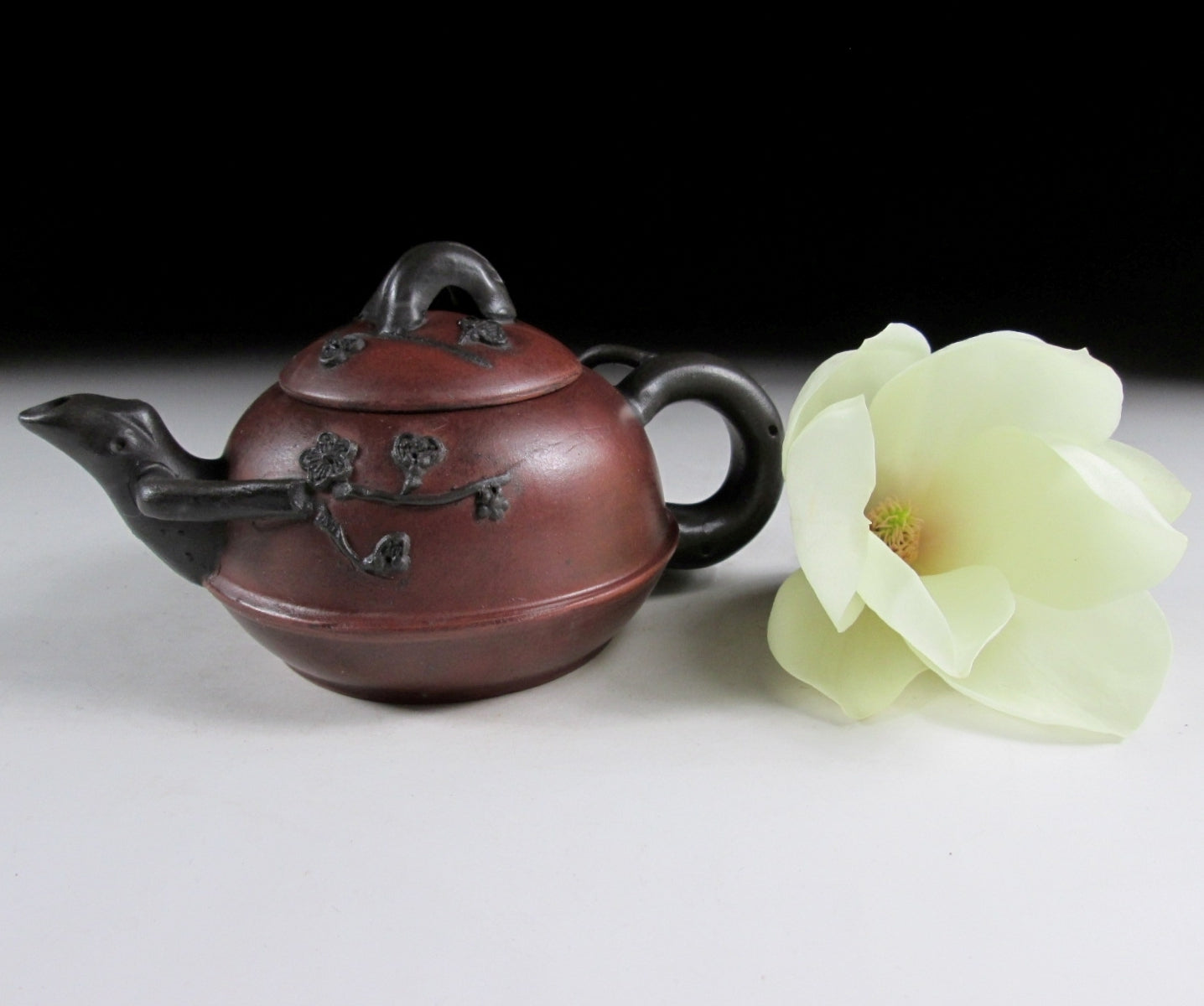 This listing is for a small production-ware Yixing style teapot made around 20 years ago. The exterior is decorated with ume blossoms and the spout and handle form part of the tree branch. It has a capacity of 150ml, and there’s a built-in strainer over the spout area. This piece has black marks suggesting that it may have been polished with something, it’s possibly better to use it for display purposes only. The stamp of the kiln can be found under the lid.