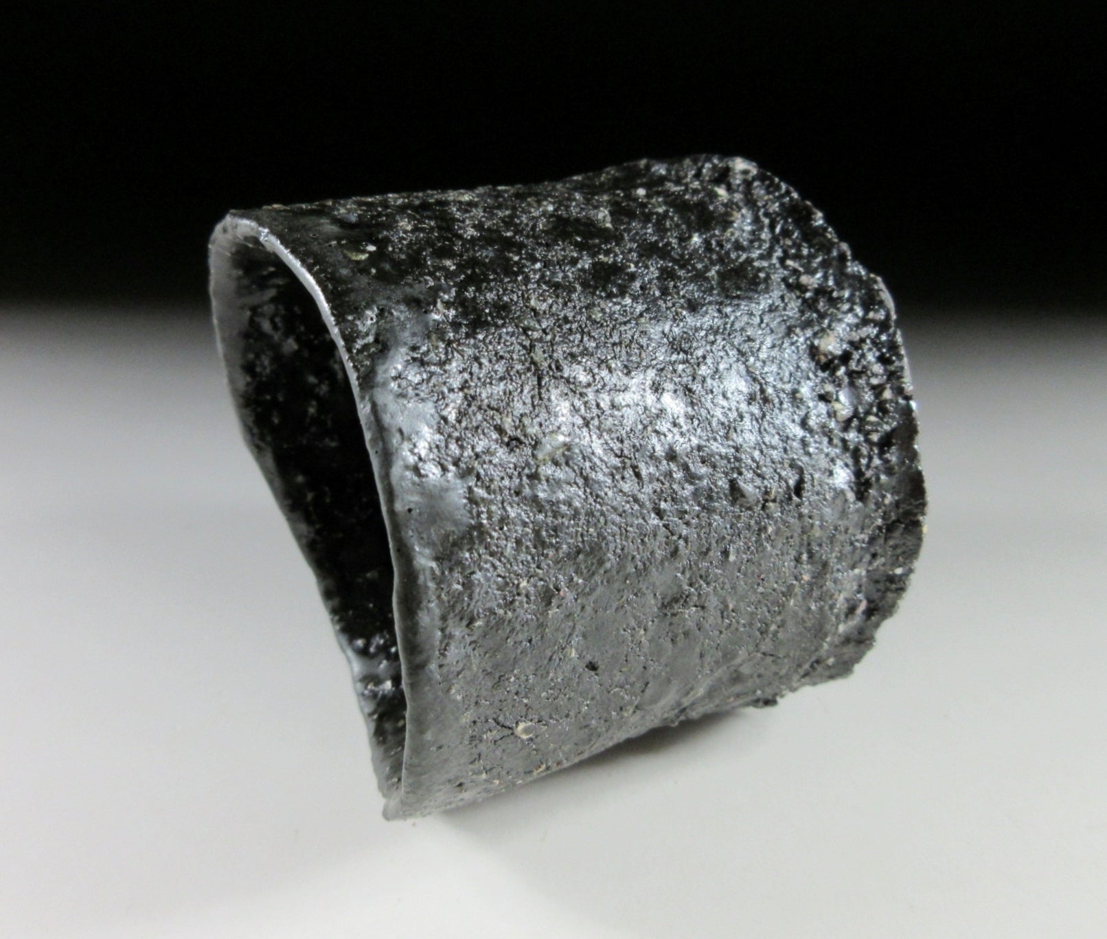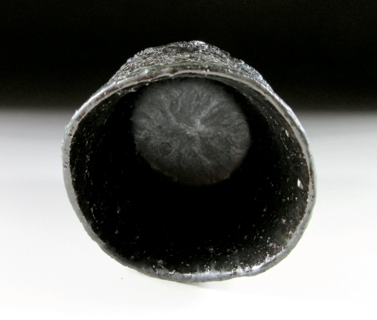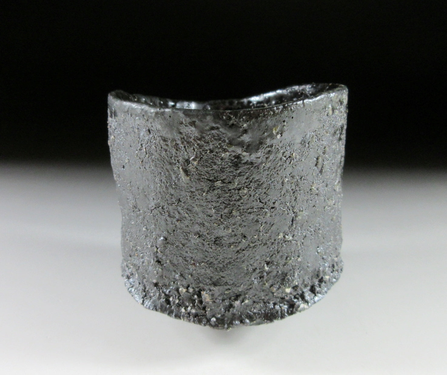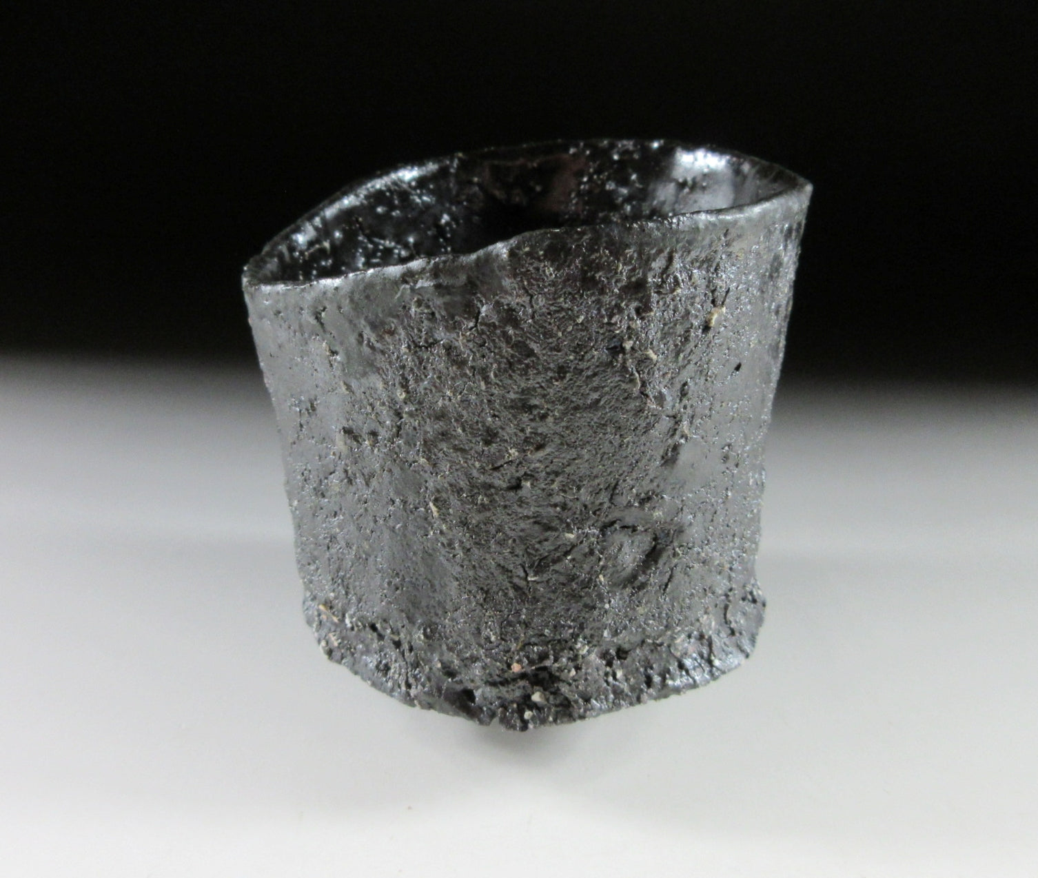 This listing is for a contemporary style Mino-ware yunomi teacup made by noted potter, Yokoyama Takuya. It is hand-turned and has a wonderfully irregular form. The entire piece is coated in black glaze, and it has a powerful and somewhat masculine appearance. This piece is made of slightly course clay, and sits very well in the hand. The mark of the potter can be found on the bottom, very sorry no box.