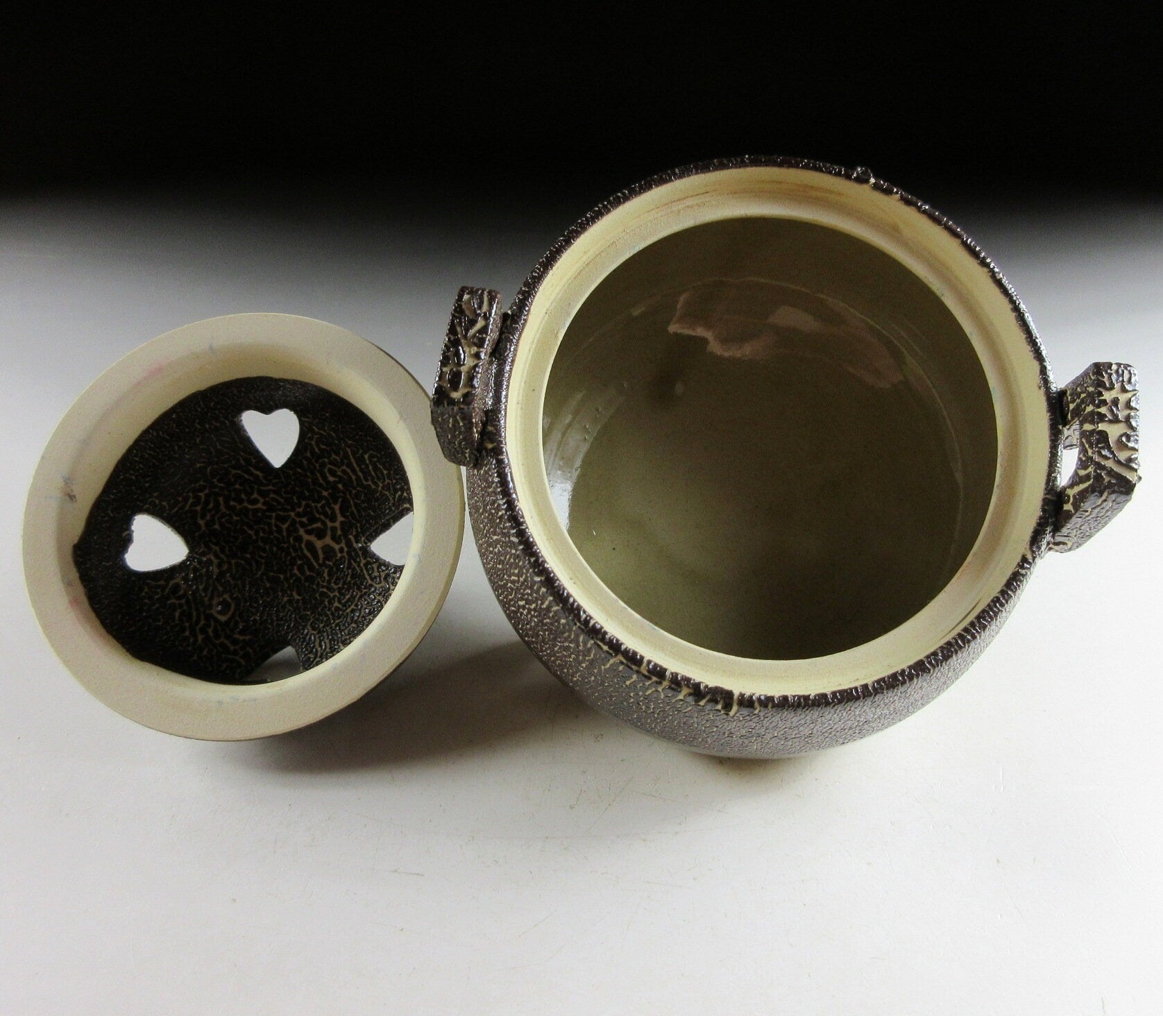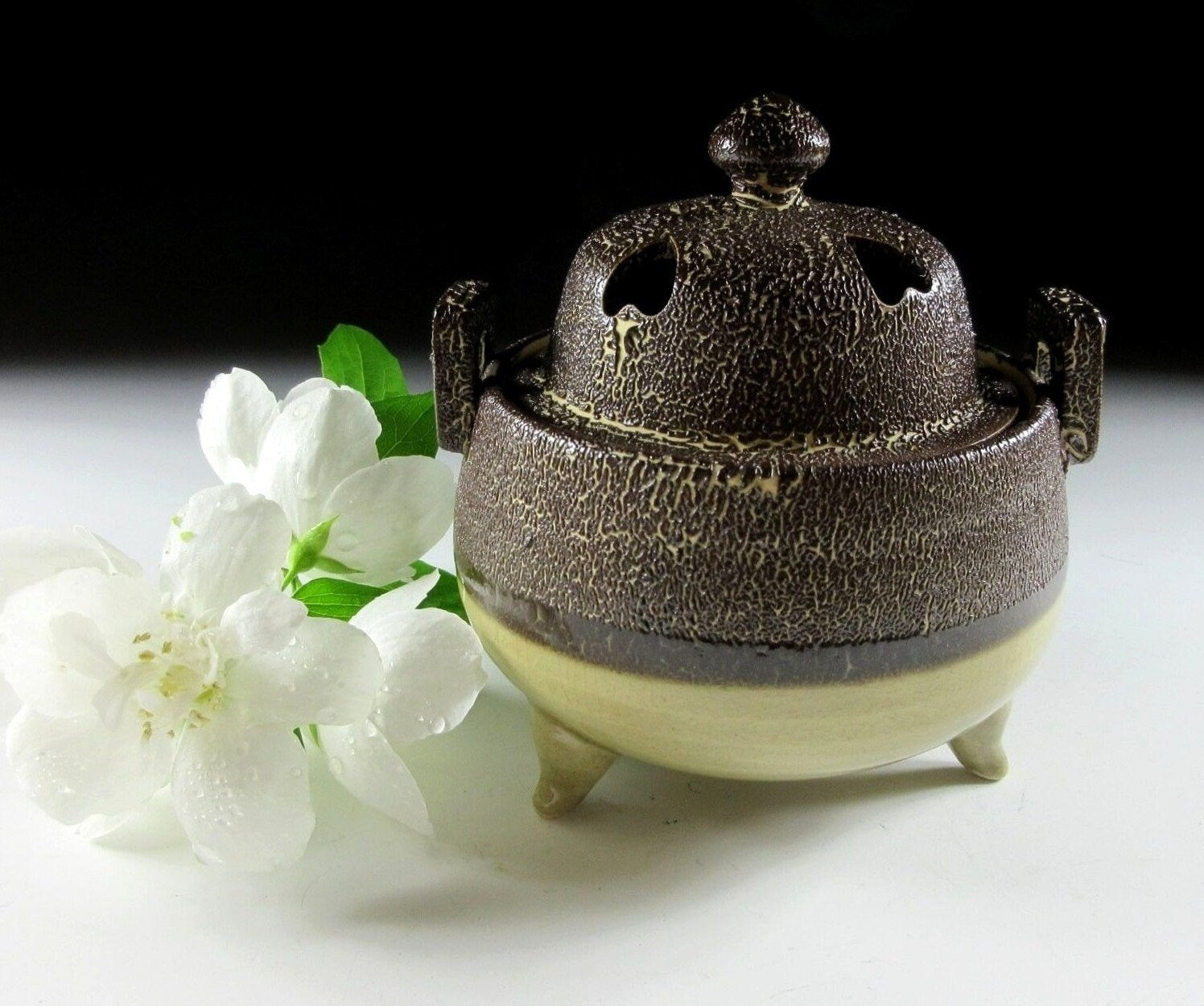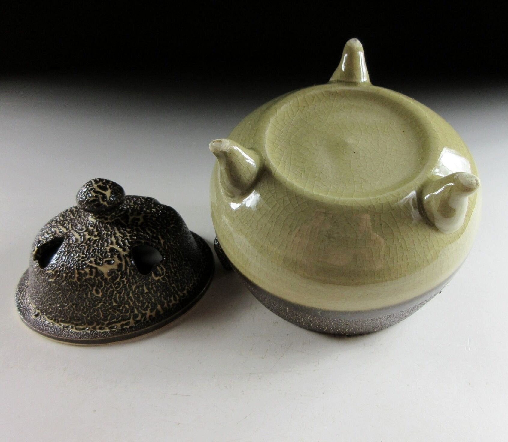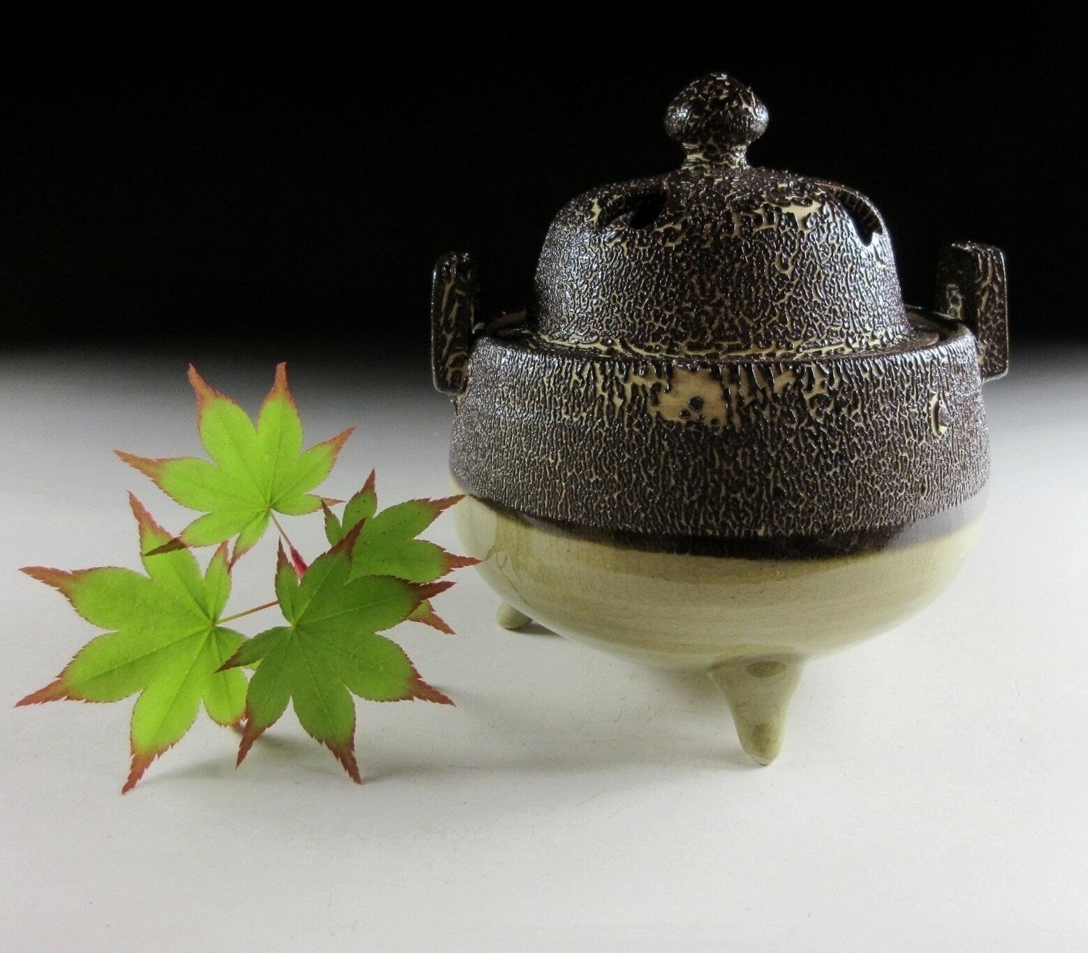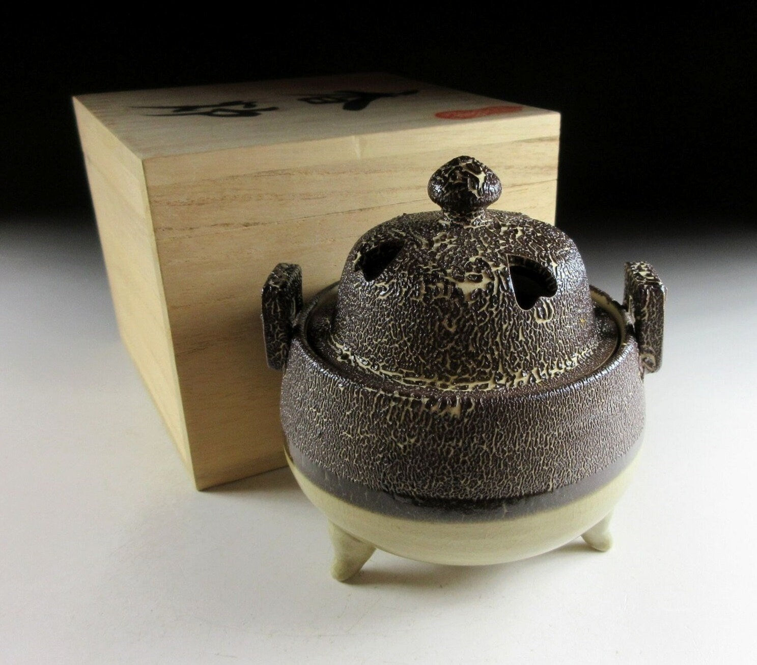 This listing is for a Soma-ware koro incense burner made around 20 years ago by Yoshimine Gama. It is wheel-thrown and the top half features dark brown sharkskin glaze. There are four ‘crane feet’ vents in the lid, and the base is supported by three feet on the bottom. The interior is nice and clean and appears unused, and it comes with its original wooden storage box.