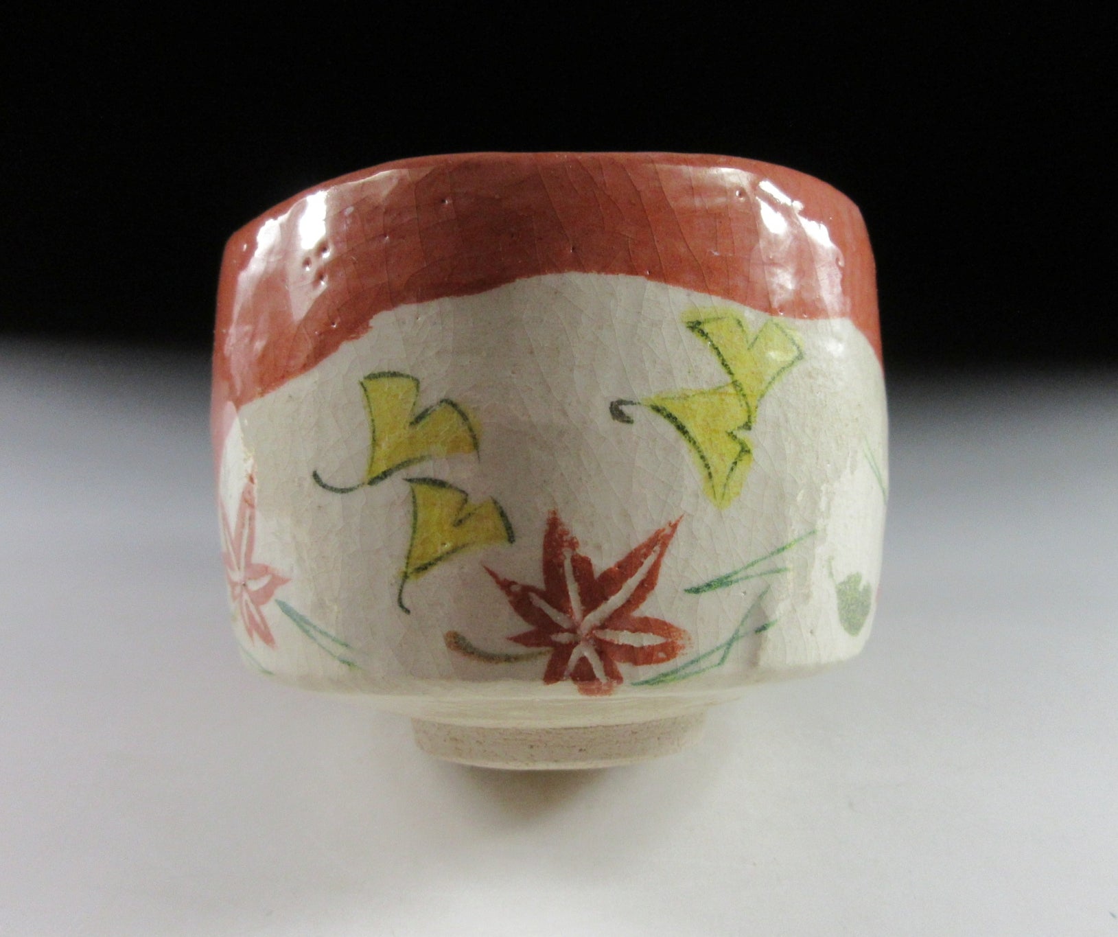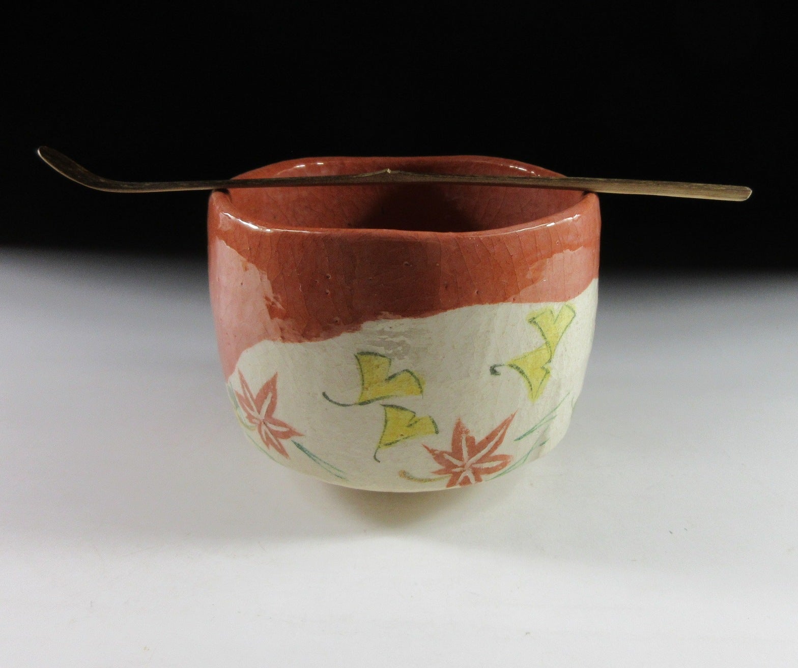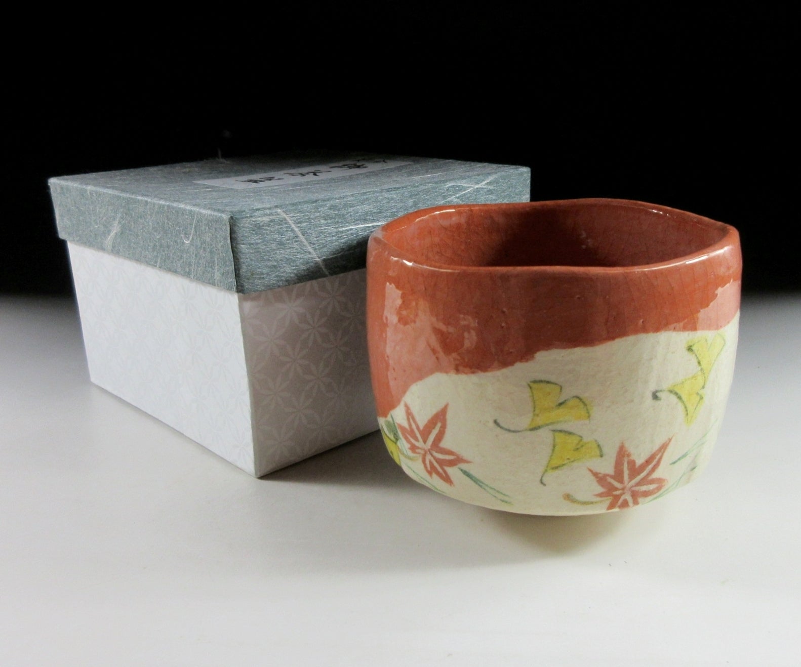 This listing is for a raku-ware chawan made around 10 years ago by noted potter, Yoshimura Rakunyu III. It is hand-turned and the front is decorated with a ‘fukiyose’ leaves in the wind pattern. This pattern is traditionally linked to autumn, and usually consists of momiji leaves, ginkgo and matsuba pine needles. The stamp of the potter can be found on the bottom, and it comes with a paper storage box. *PLEASE NOTE THAT THE CHASHAKU TEA SCOOP IS NOT INCLUDED.