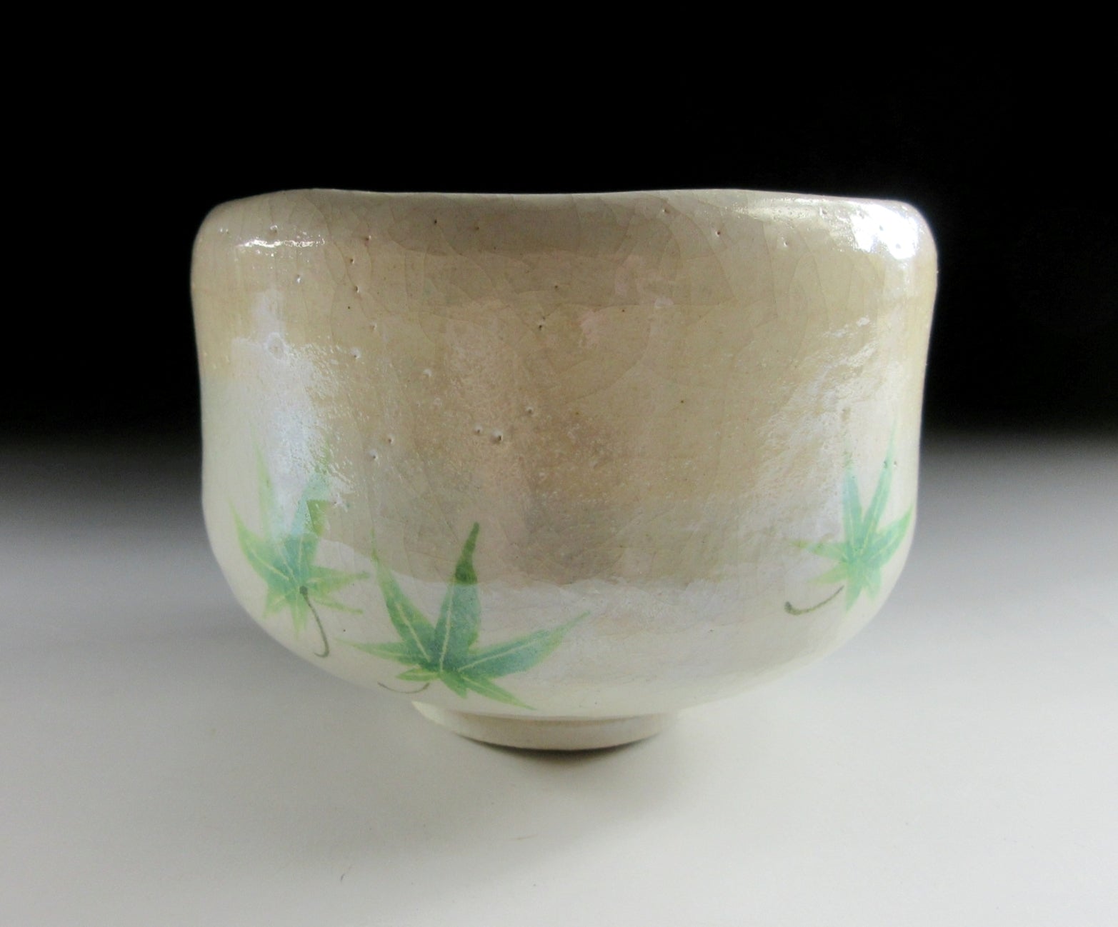 This listing is for a modest Raku-ware chawan made around 20 years ago by noted potter, Yoshimura Rakunyu III. It is hand-turned and made of low-fired earthenware. The front is decorated with green kaede leaves over a light coloured base, and there’s one small kaede leaf on the interior. Kaede are a popular motif for summer teaware because the green colour tends to have a cooling effect, and kaede are thought to convey calm and tranquillity. The stamp of the potter can be found on the bottom, and it comes with its original signed wooden storage box. It also comes with a Japanese language profile paper. *PLEASE NOTE THAT THE CHASHAKU TEA SCOOP IS NOT INCLUDED IN THIS LISTING.
