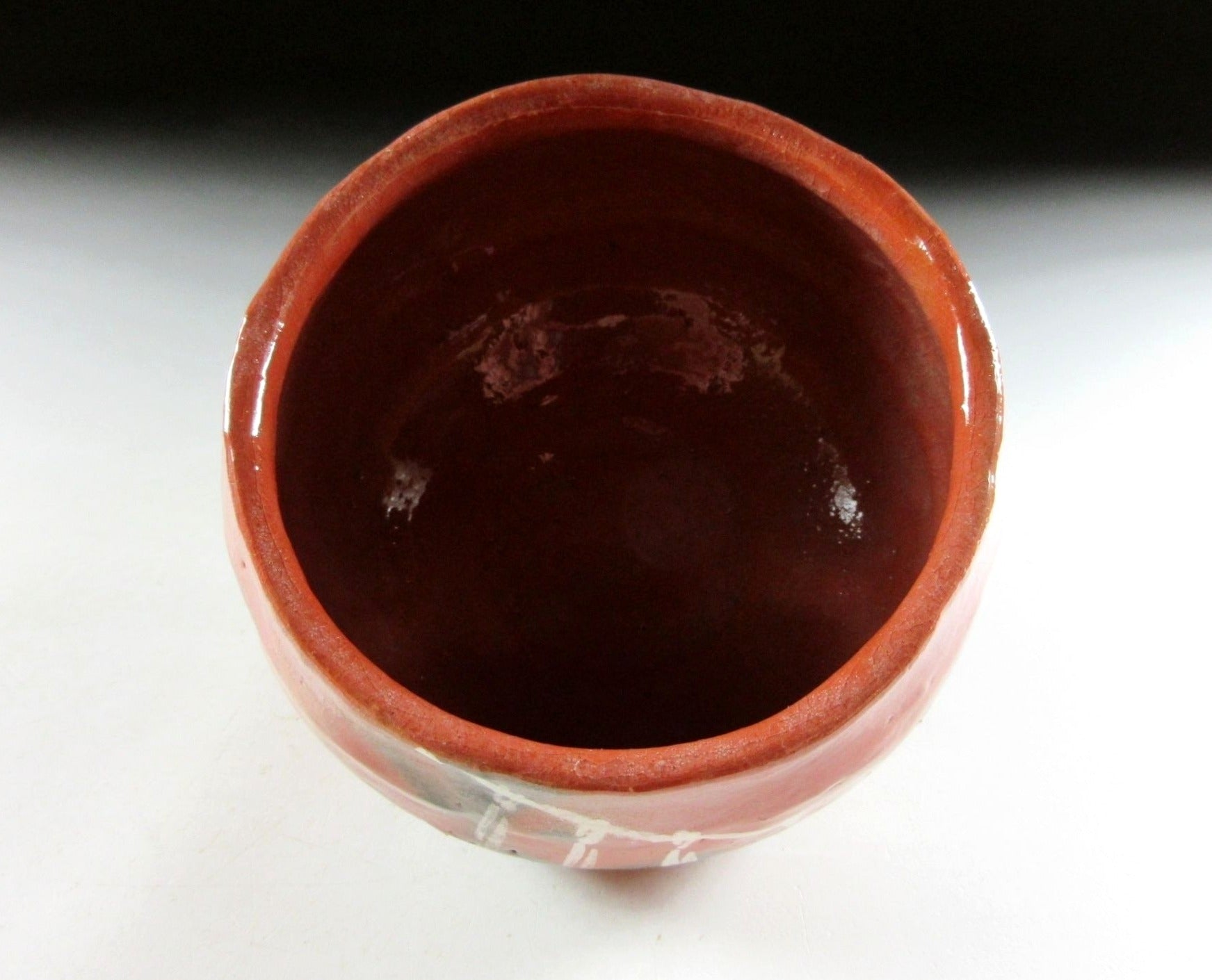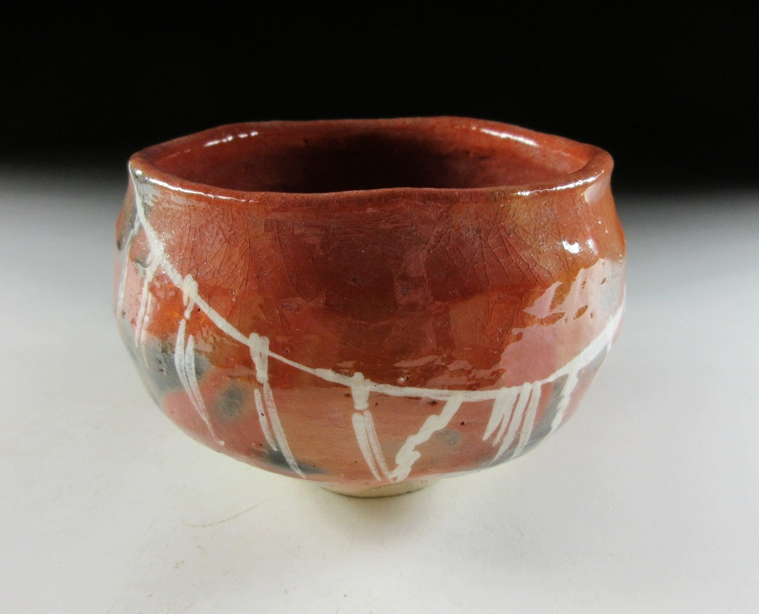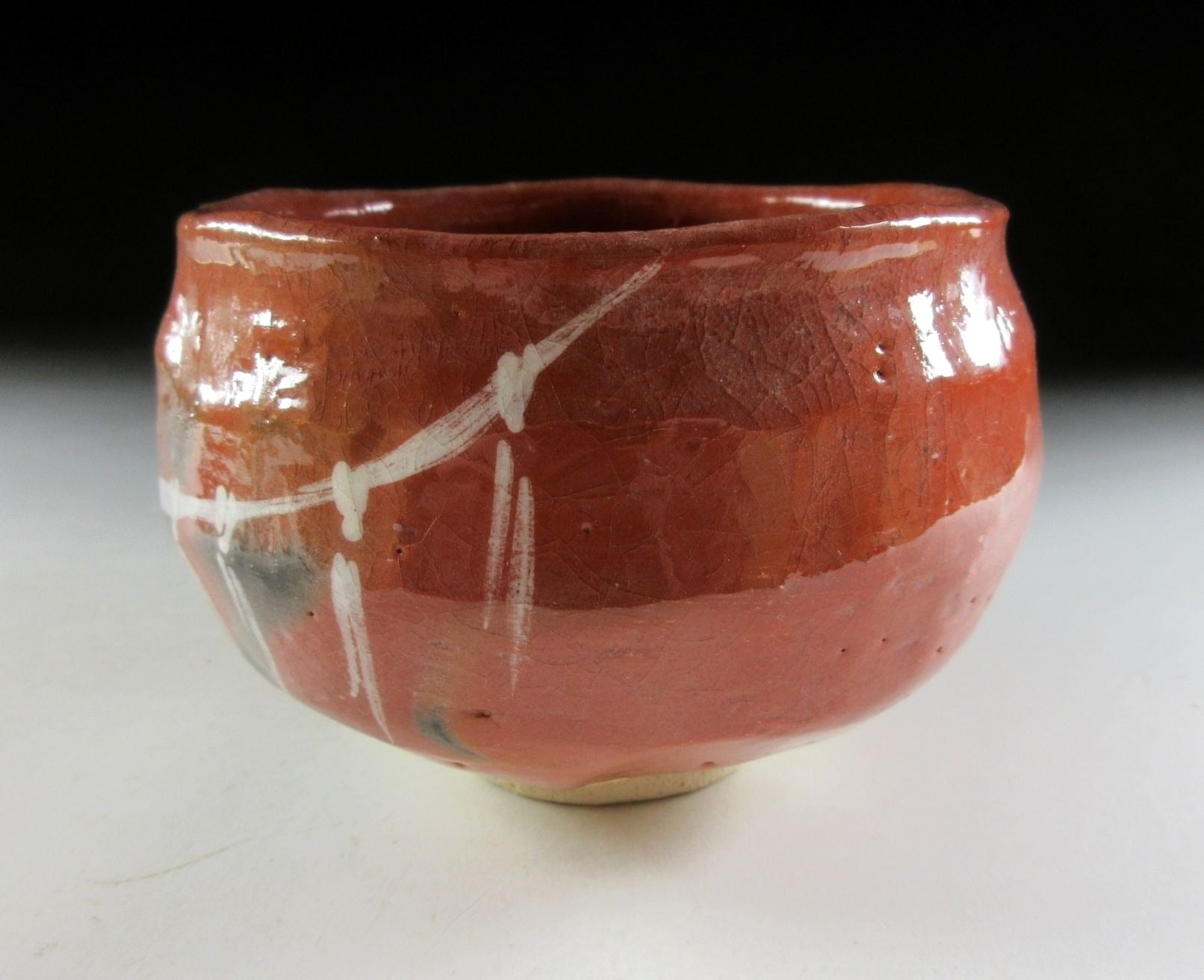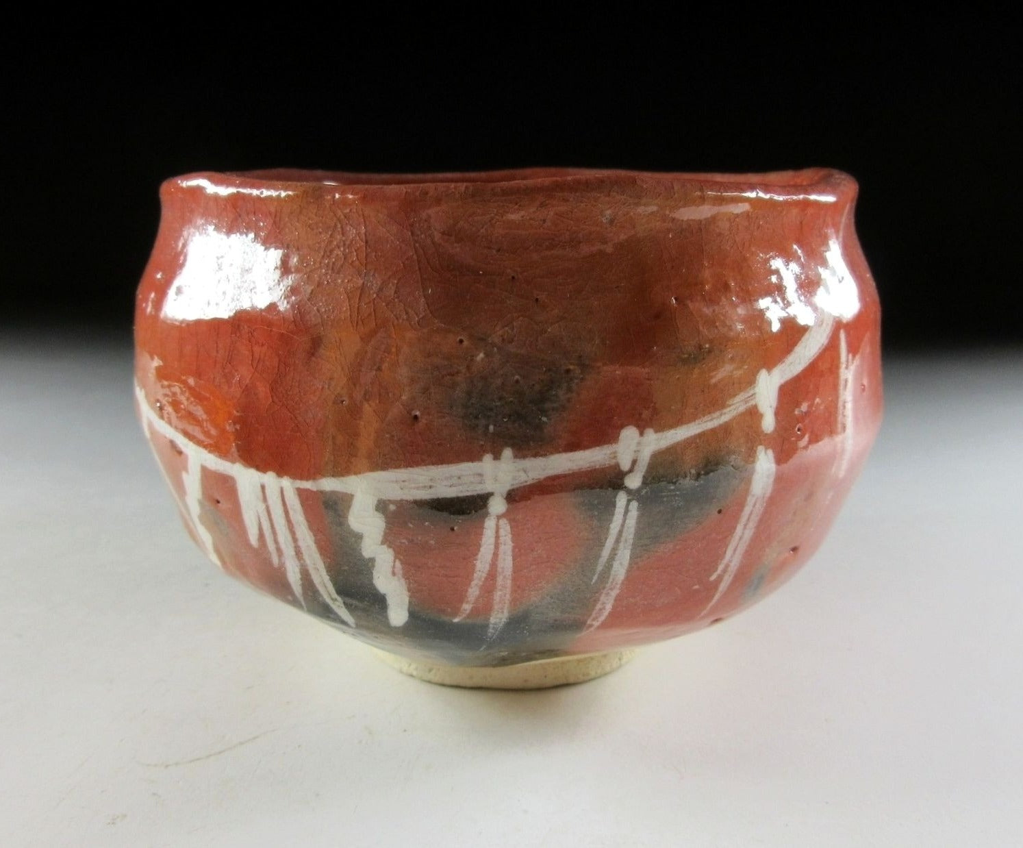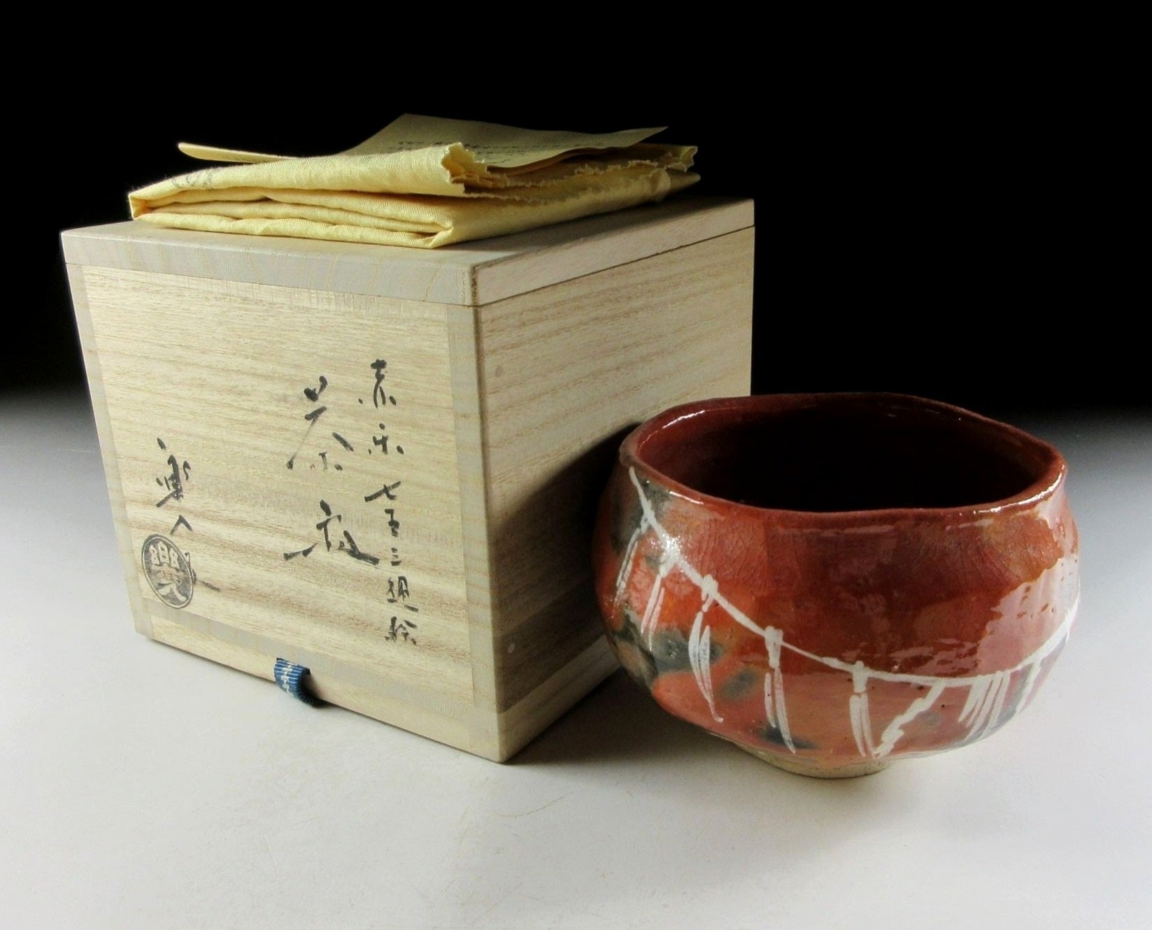 This listing is for a splendid aka Raku-ware chawan made around 20 years ago by noted potter, Yoshimura Rakunyu III. It is hand-turned and the front is decorated with a hand-painted depiction of straw ‘shimenawa’ rope decorated with zigzag-shaped paper called ‘shide’. Shide are used during Shinto rituals, they’re also found adoring trees and other scared objects in and around the precincts of shrines. This is a beautiful bowl to usher in the New Year, perfect for enjoying your first bowl of tea for the year! The stamp of the potter can be found on the bottom, and is comes with its original signed wooden storage box. It also comes with a stamped yellow wrapping cloth for when the bowl is not in use, as well as a Japanese language profile paper about the potter.