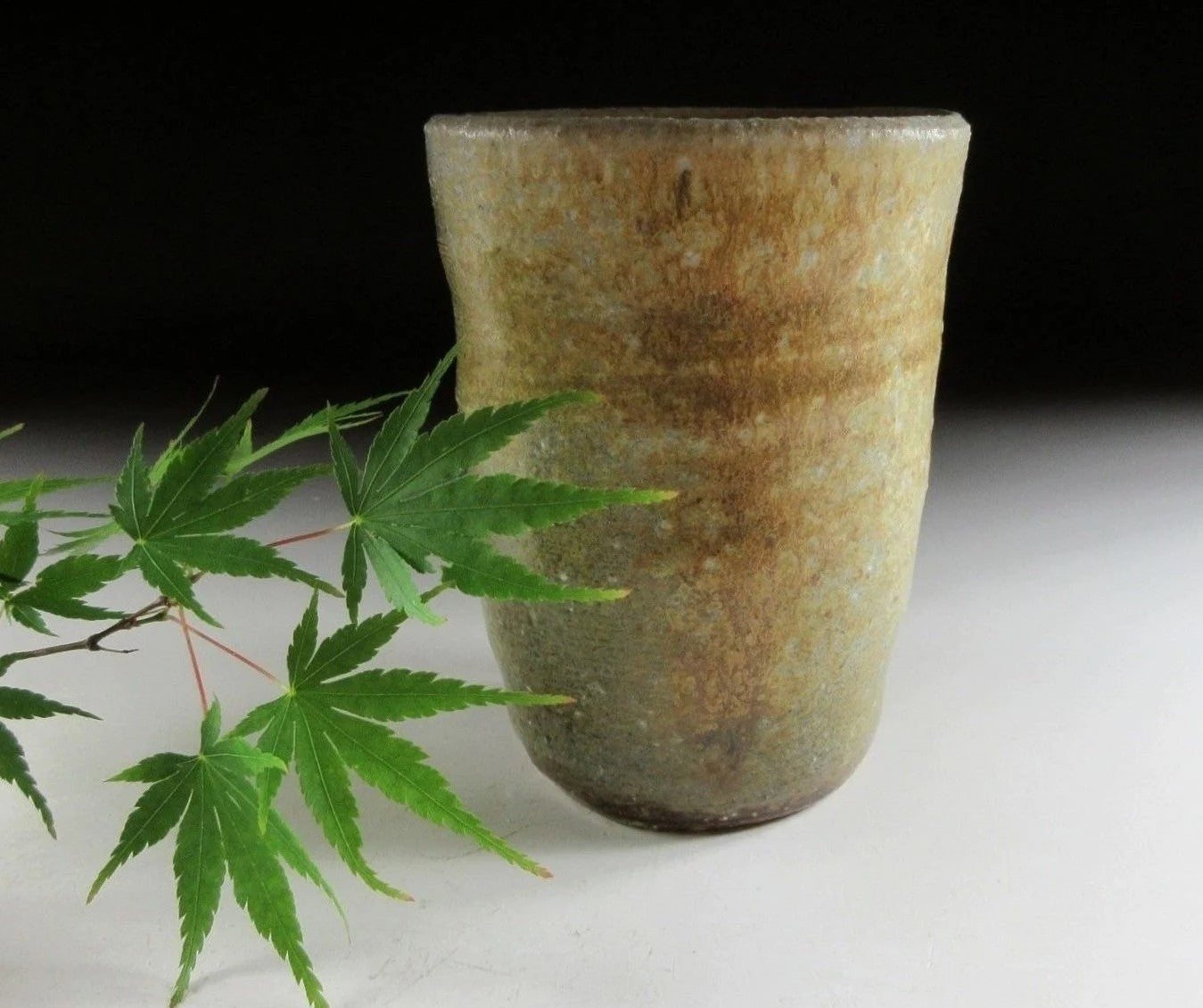 This listing is for a wood-fired Bizen-ware beer cup made around 20 years ago by noted potter, Yoshioka Katsumi. It is wheel-thrown and the front is coated in a generous layer of natural ash glaze. The back of the cup has a slightly glossy finish, this glossiness is due to the cup being covered in an iron-rich dark slip before firing. Bizen-ware is believed to be ideal for serving beer, because the bubbles are smoother. Bizen has lots of small indentations on the interior, which results in a smoother beverage. This cup has a capacity of around 325ml, and the signature of the potter can be found on the bottom. It comes with a paper storage box as well as a Japanese language profile paper about the potter.