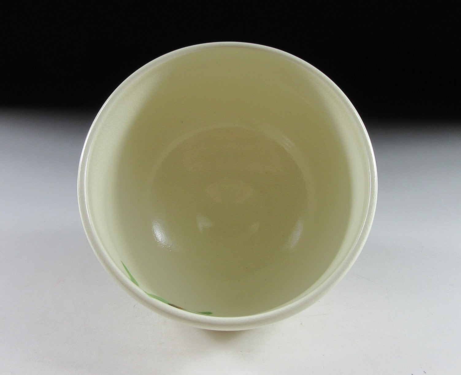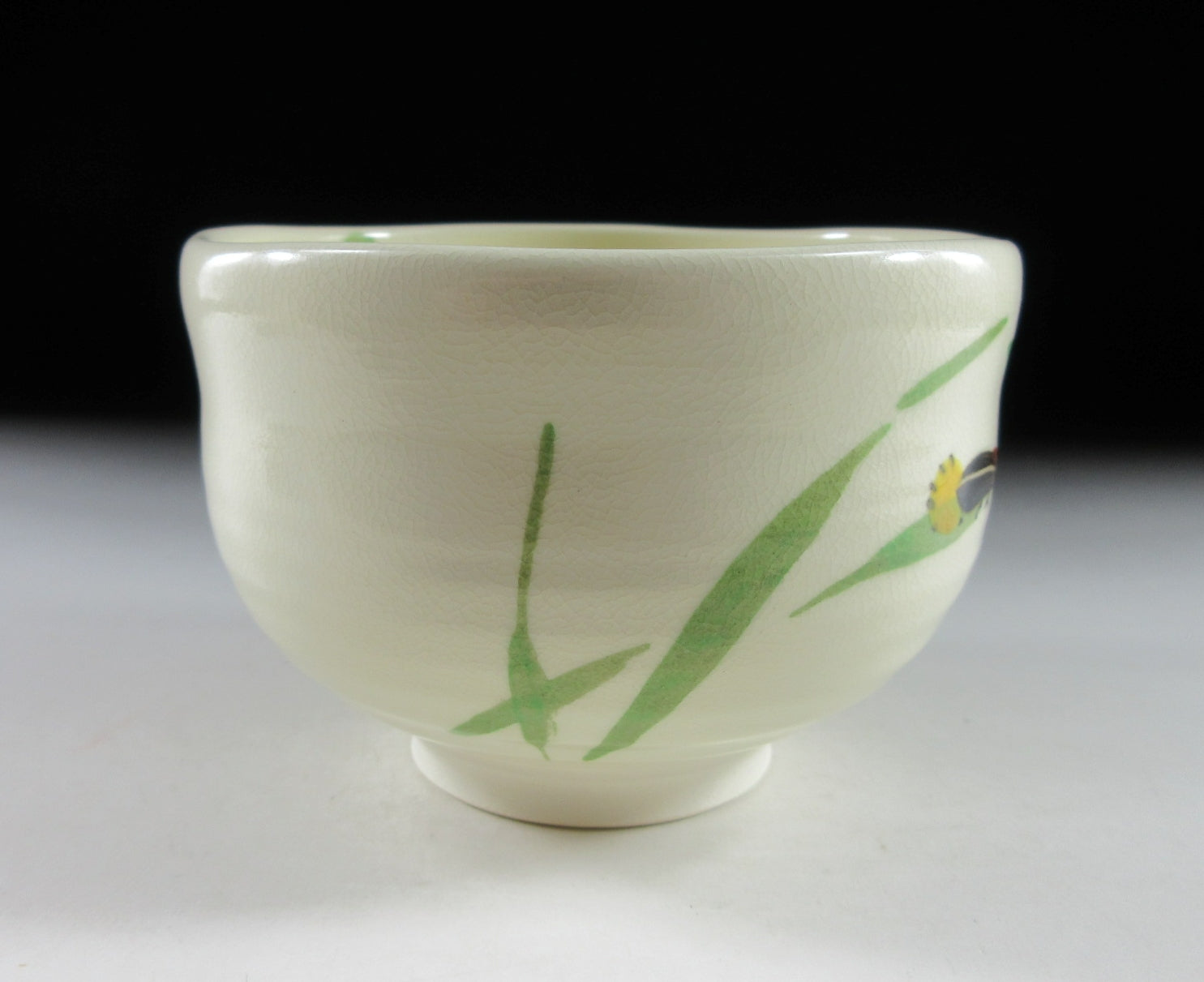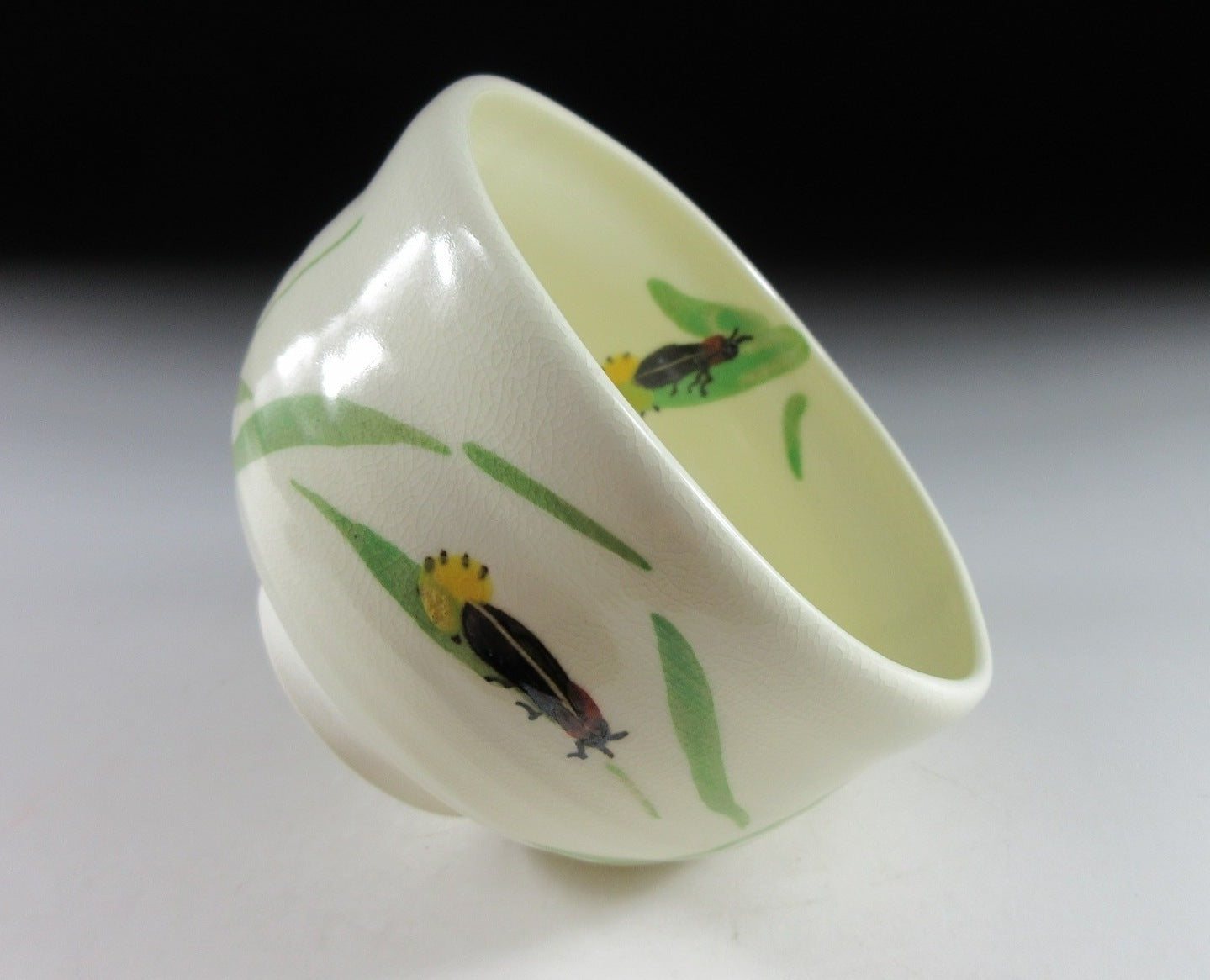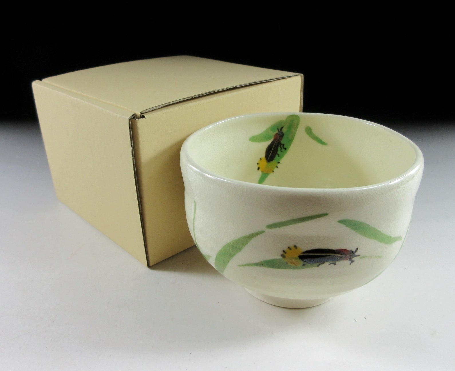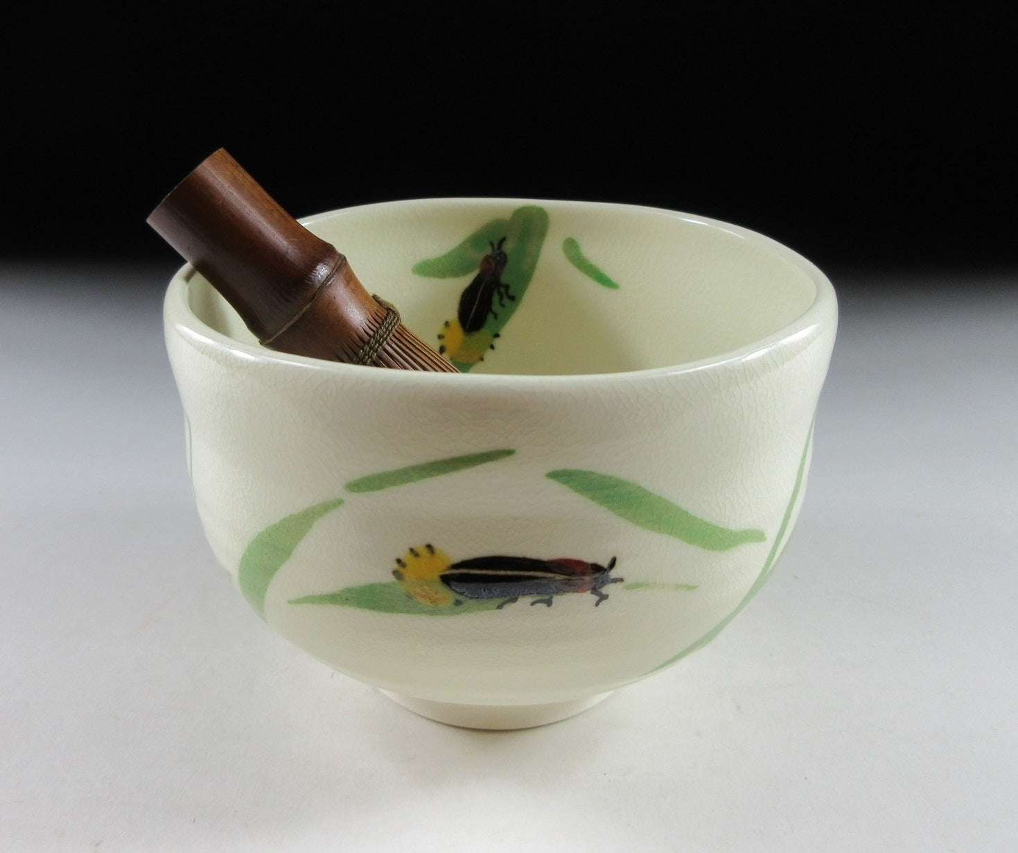 This listing is for a SMALL nodate size chawan made by Yoshizo Asami IV. It is wheel-thrown and decorated with hotaru, or fireflies as they are known in English. A popular pastime during the rainy season is to go ‘hotaru-gari’, which means hunting for fireflies. Fireflies inhabit small streams and rice fields, and they have appeared in Japanese literature dating back to the 8th century. The stamp of the potter can be found on the bottom, and it comes with a paper storage box. *PLEASE NOTE THAT THE CHASEN TEA WHISK IS NOT INCLUDED IN THIS LISTING.