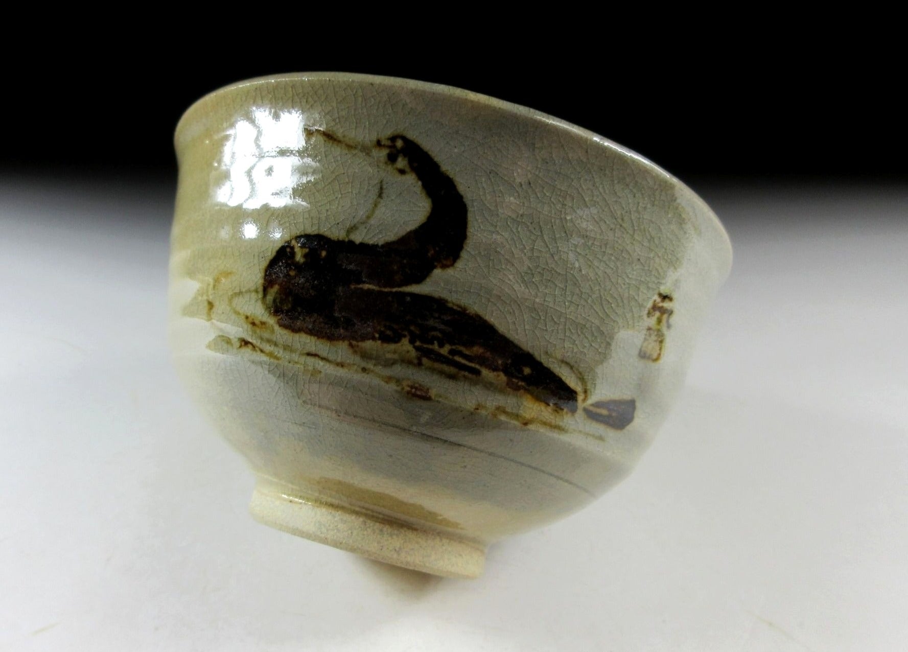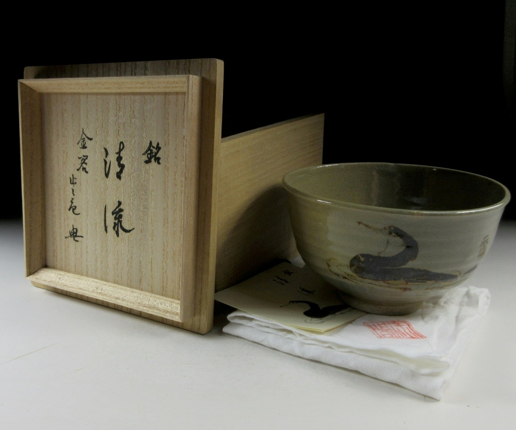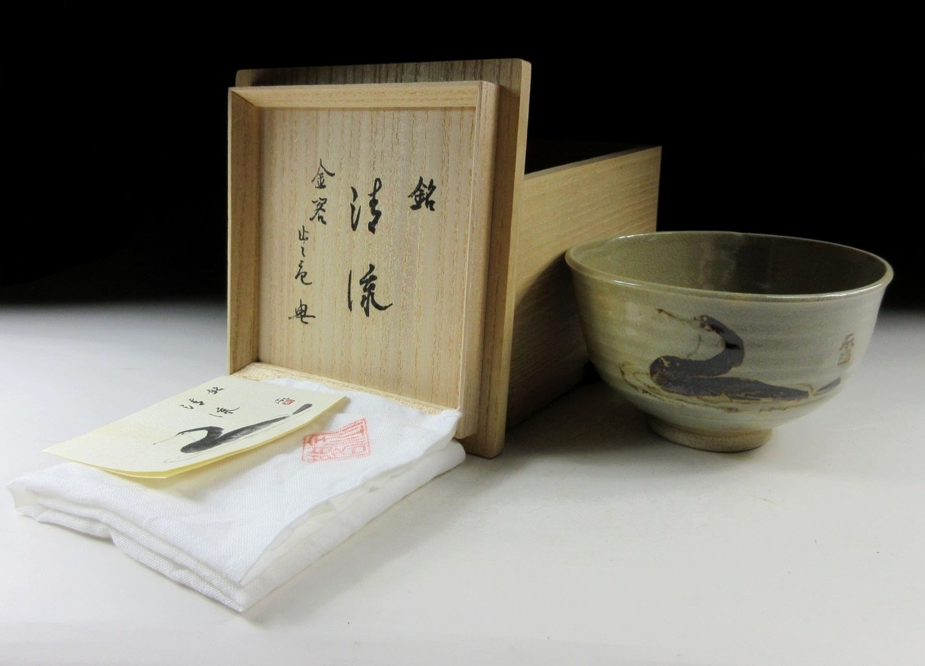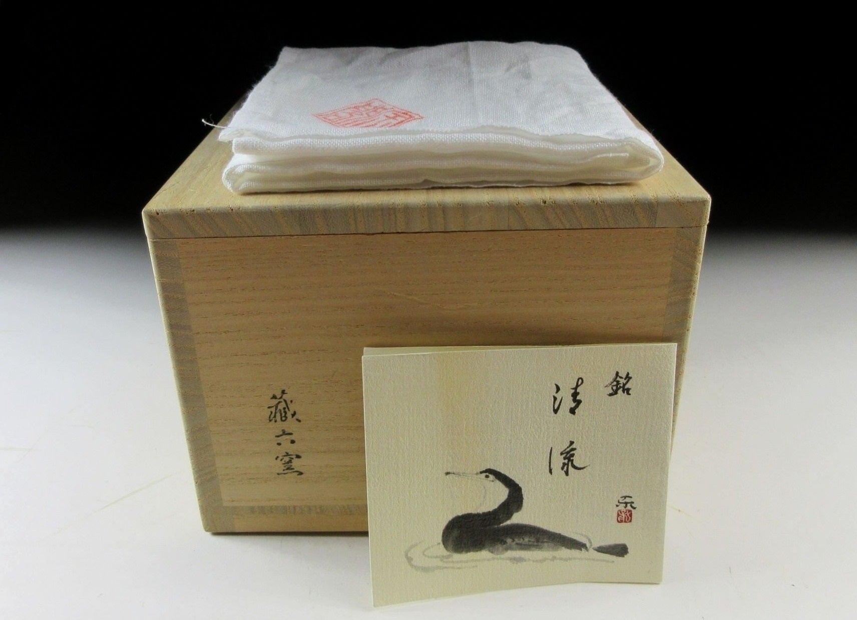 This listing is for a very special Kyo-ware chawan which is a collaboration between two Kyoto artisans, potter Zoroku Mashimizu IV and painter Kato Toichi. It is wheel-thrown by Zoroku and the decoration is by Kato. This modest piece features an iron oxide depiction of a cormorant fishing bird over a stoneware base. Cormorant fishing, known as ukai in Japanese, is a 1300 year old tradition particularly famous along the Nagaragawa River in Gifu, and the Arashiyama part of Kyoto. Fishermen in long wooden boats lead cormorants that swim alongside the boat catching fish. The event attracts many visitors during the summer season, and master fishermen have official patronage from the emperor. Kato’s signature can be found to the right of the cormorant, and Zoroku’s seal is stamped on the bottom. It comes with its original signed wooden storage box, and a signed white wrapping cloth for when the bowl is not in use. It also comes with a Japanese language profile paper.