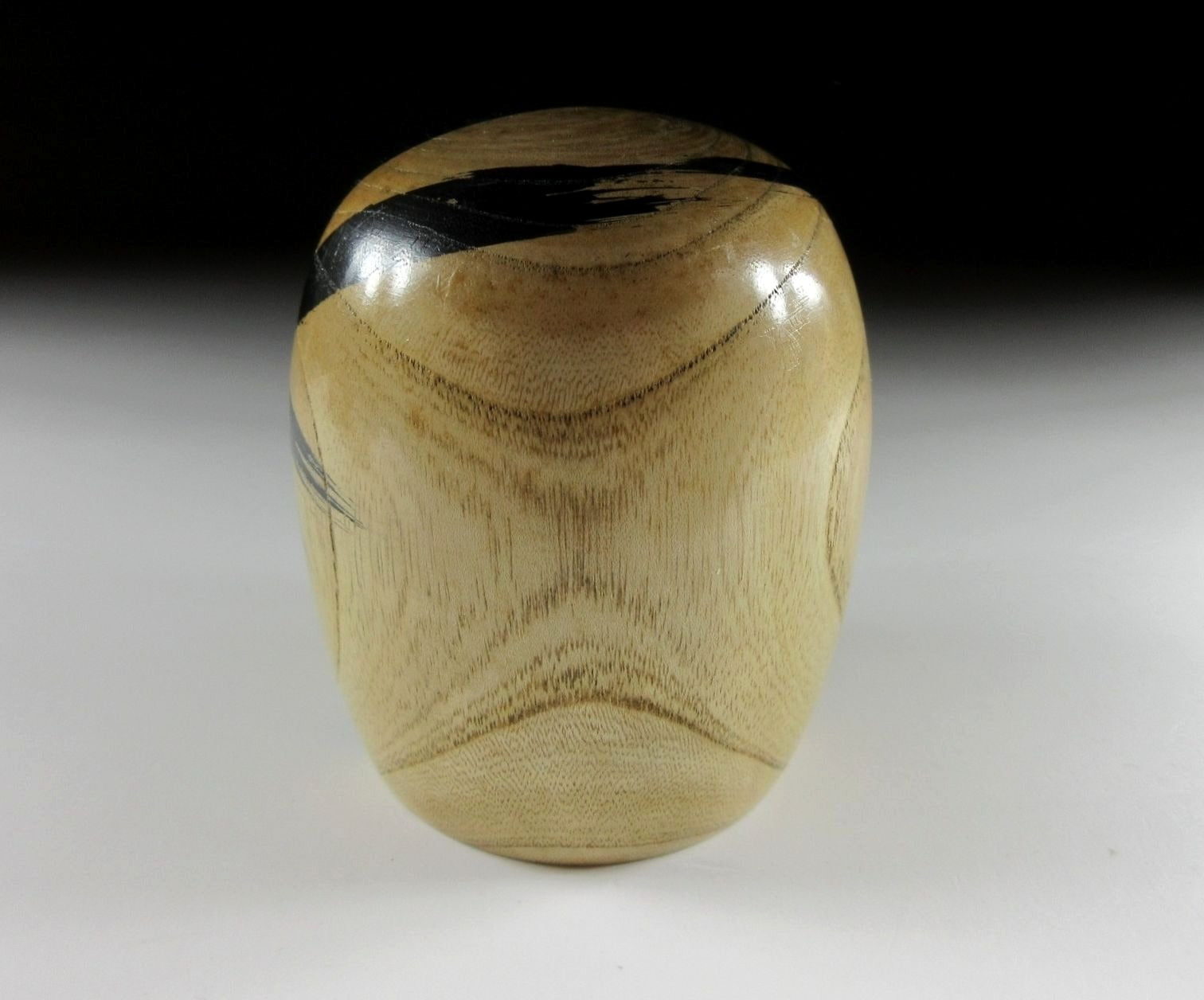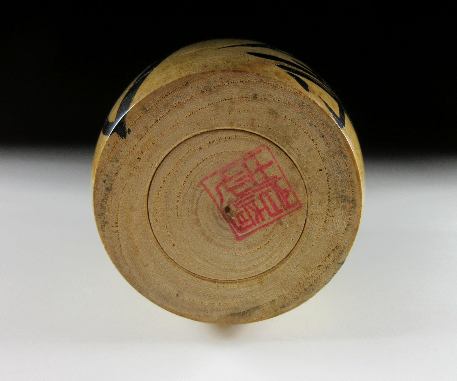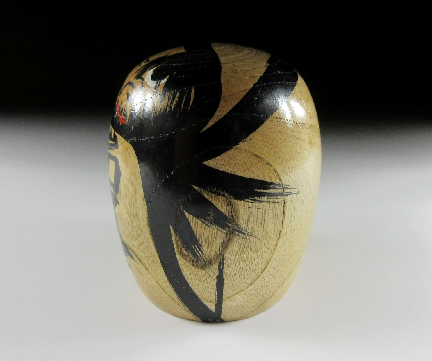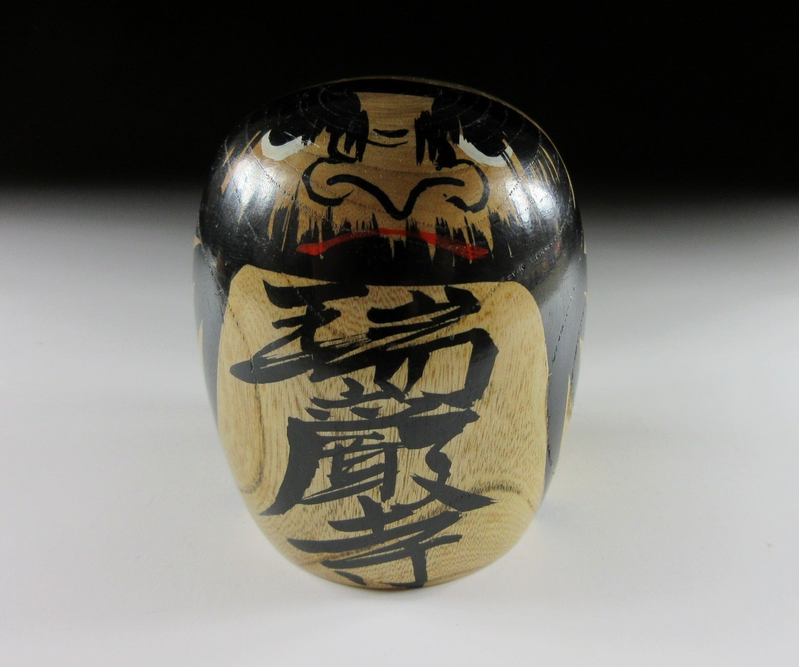 This listing is for a vintage Daruma from Zuiganji temple in Miyagi Prefecture. Zuiganji was founded during the Heian period by Jikaku Daishi in 828CE. Jikaku studied Buddhism in China during the Tang dynasty, and became the third abbot of the Tendai sect at Enryakuji Temple after he returned to Japan. He was responsible for the construction of buildings to store the sutras and religious items that he brought back from China. Visitors to Zuiganji can purchase wooden Daruma as souvenirs, as well as small Daruma containing omikuji fortune slips. The Daruma in this listing was most likely purchased as a souvenir, and the writing on the front reads as ‘Zuiganji’. The stamp of the craftsperson can be found on the bottom.
